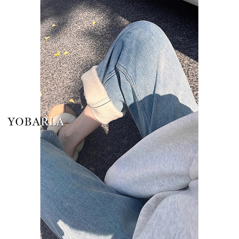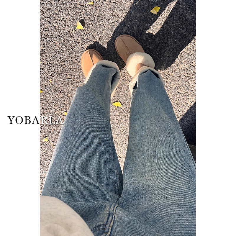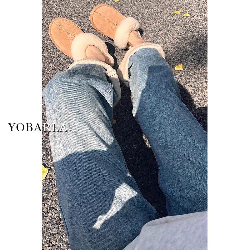 娅丽达加绒加厚锁色窄版阔腿牛仔裤女2025冬季新款显瘦直筒裤子潮