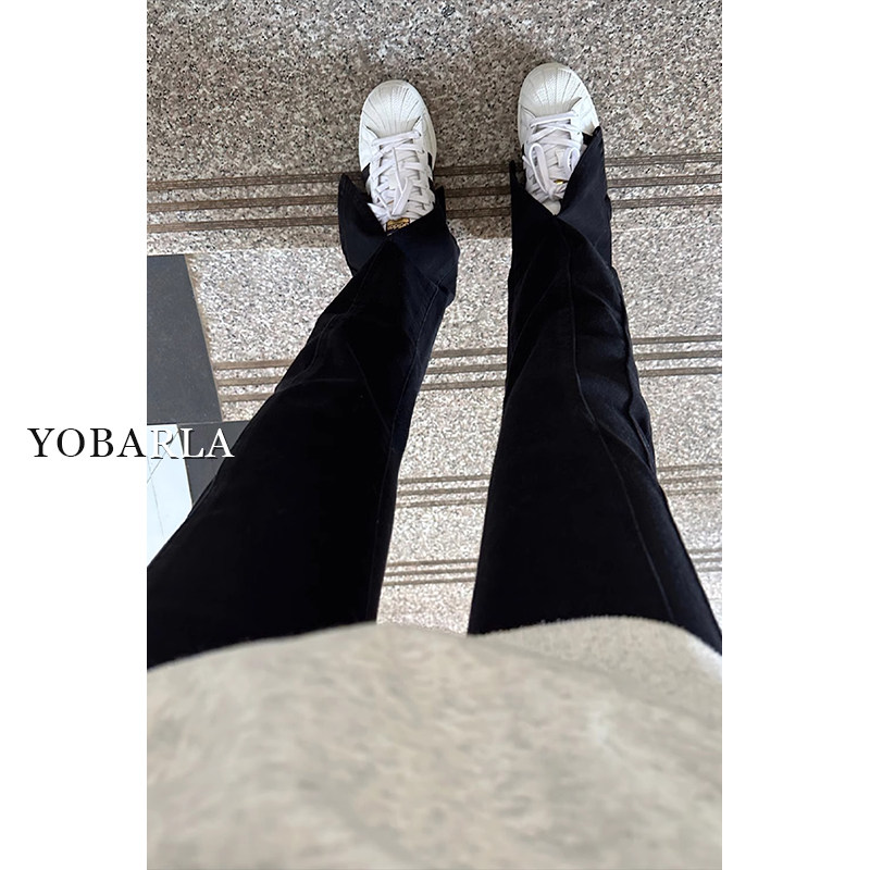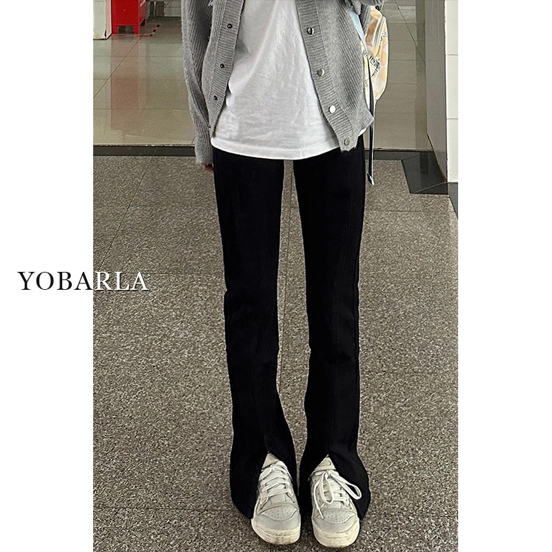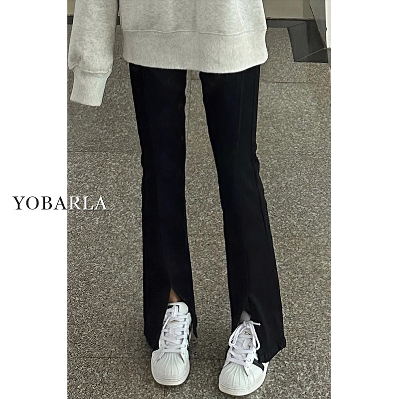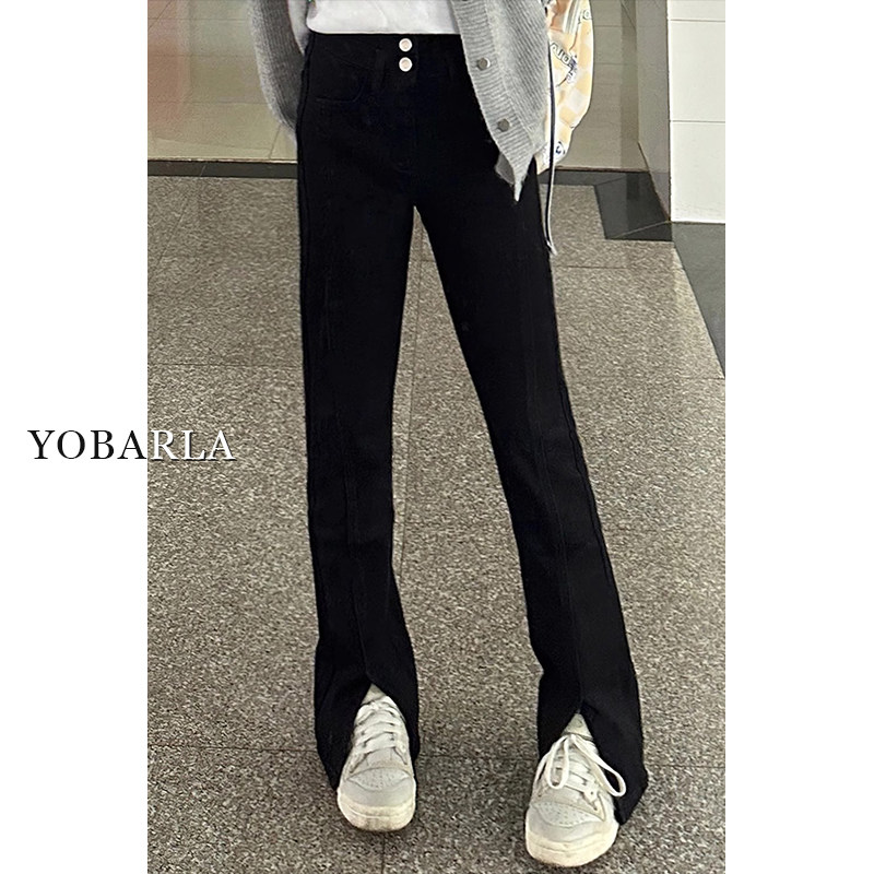 淘宝黑色开叉微喇牛仔裤女秋冬加绒大码胖mm高腰显瘦梨形身材弹力裤子