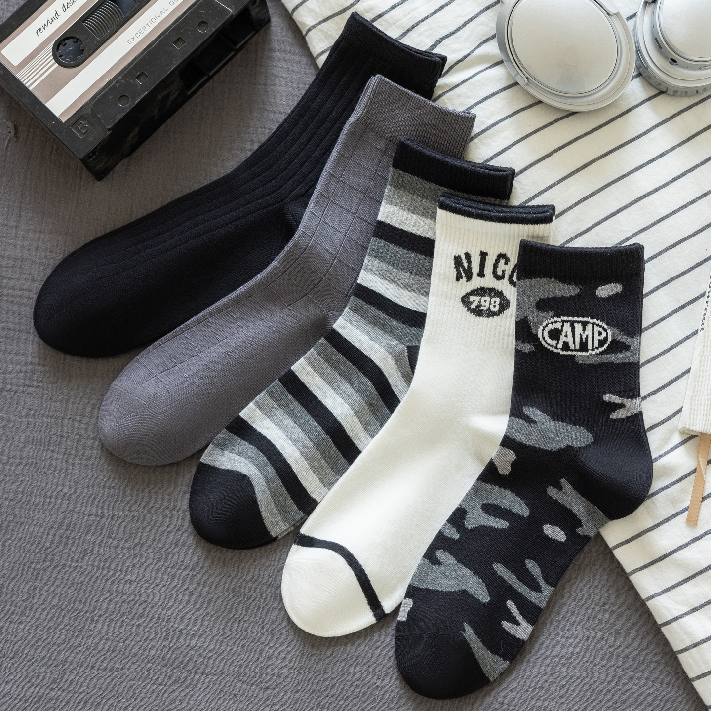 天男士精梳长绒棉袜橡筋款中筒袜色纺抗菌防臭商务休闲冬袜子5双装