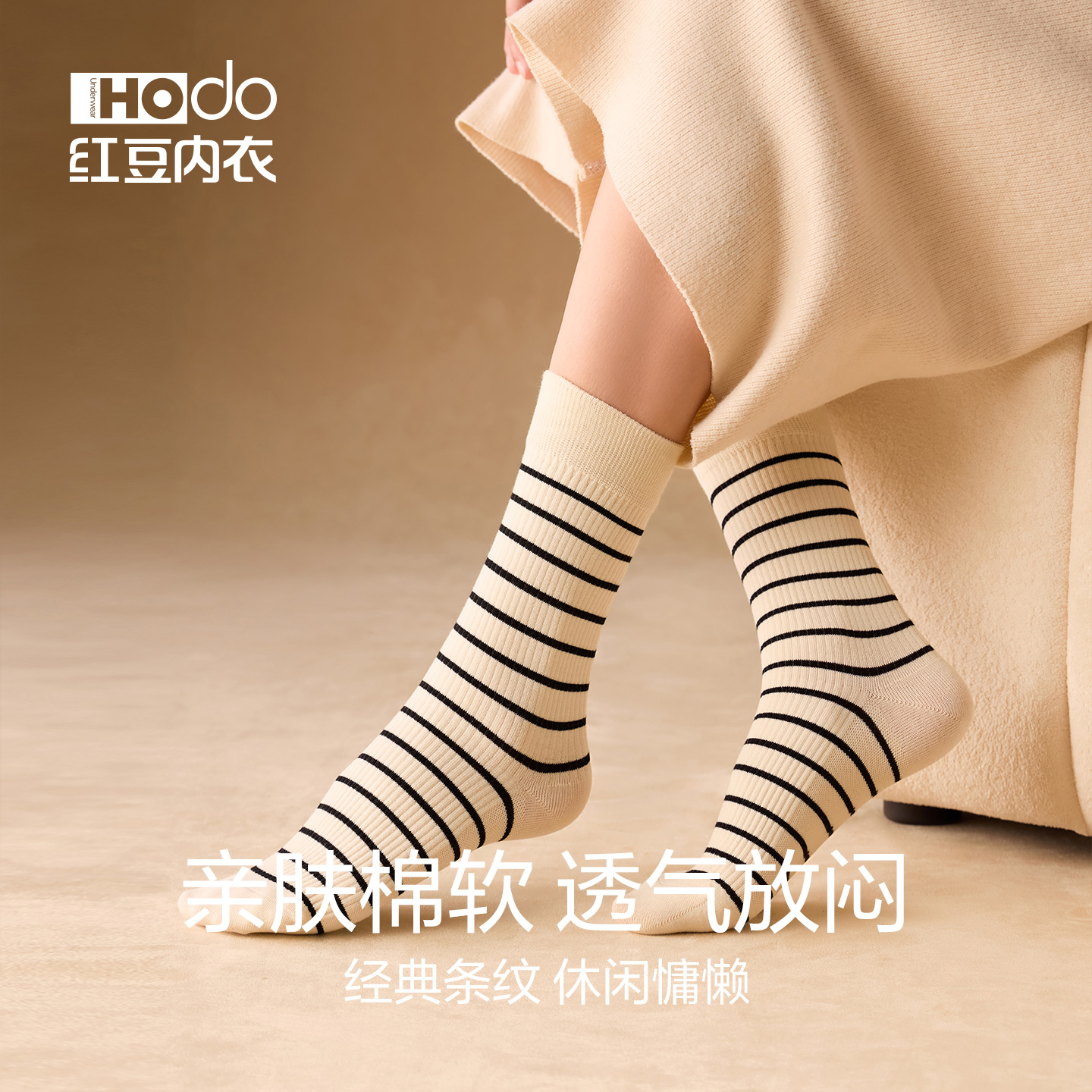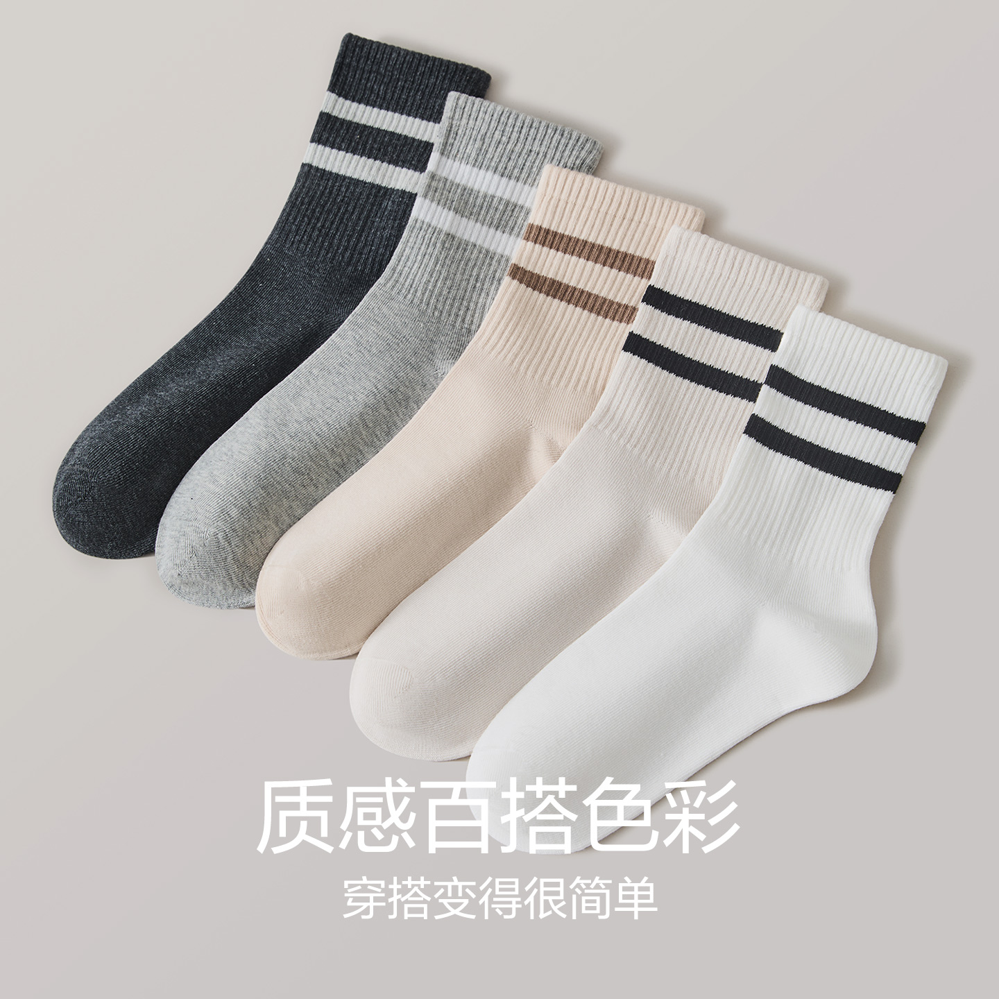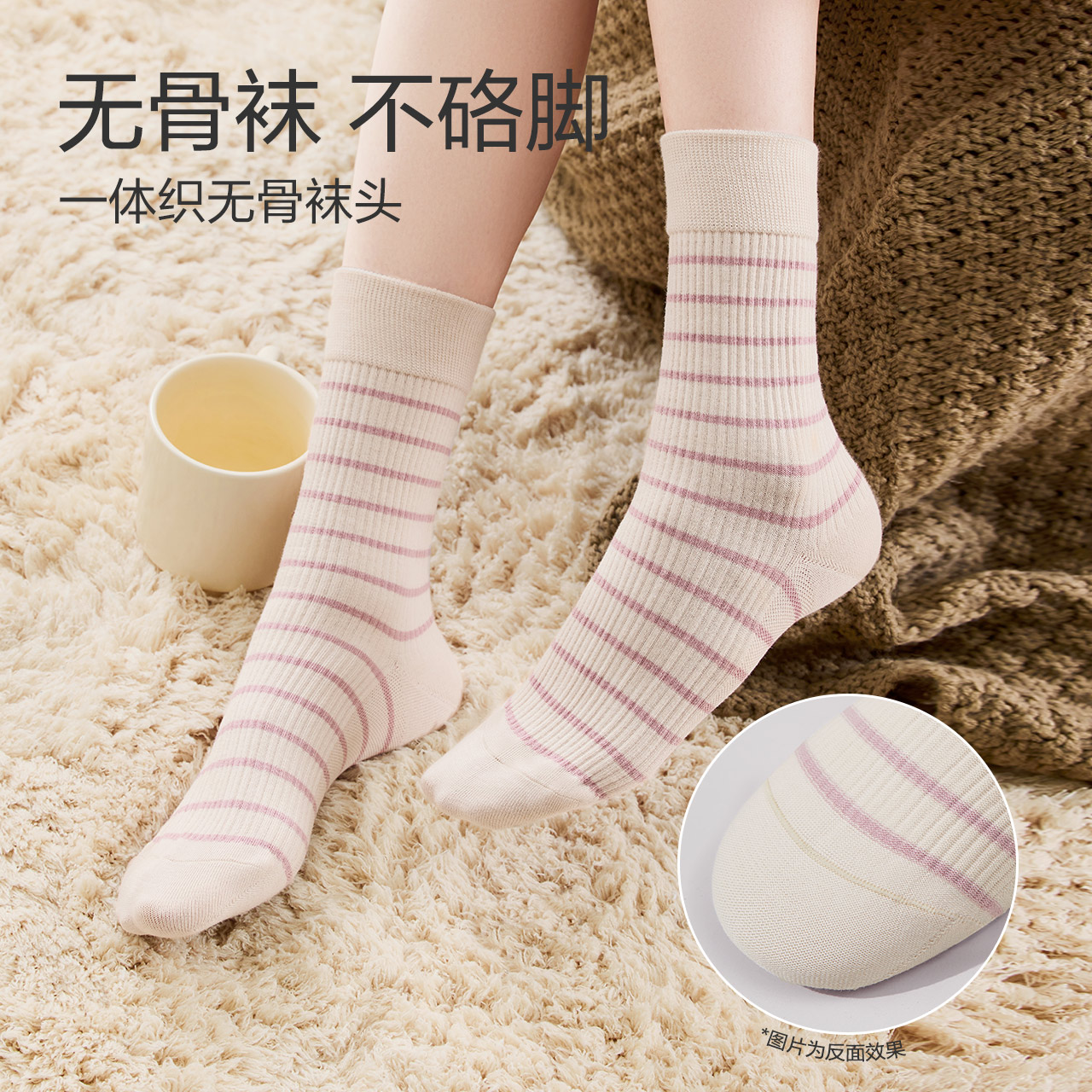 天猫女士精梳棉袜抗菌无骨中筒袜休闲条纹长袜时尚保暖防臭袜子5双装