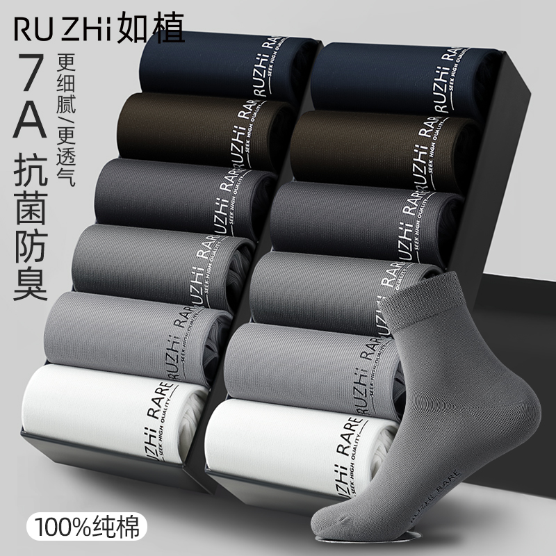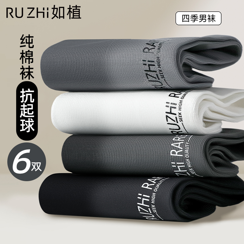天猫如植RUZHI袜子男士秋冬中筒袜纯棉抗菌防臭透气吸汗休闲棉袜男款