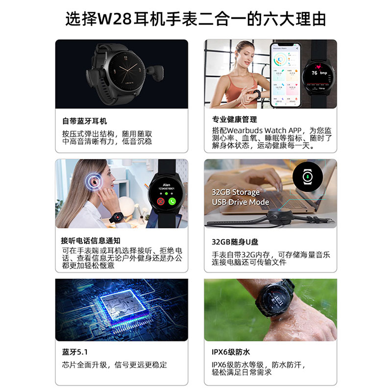 天猫Aipower艾智尔耳机手表二合一MP3播放器蓝牙通话运动跑步专用降噪睡眠血氧心率监测智能手环WEAR WATCH Buds
