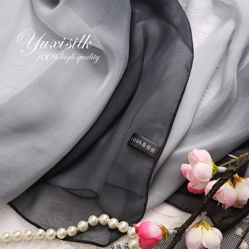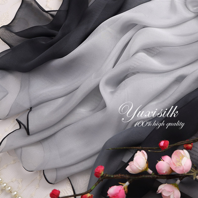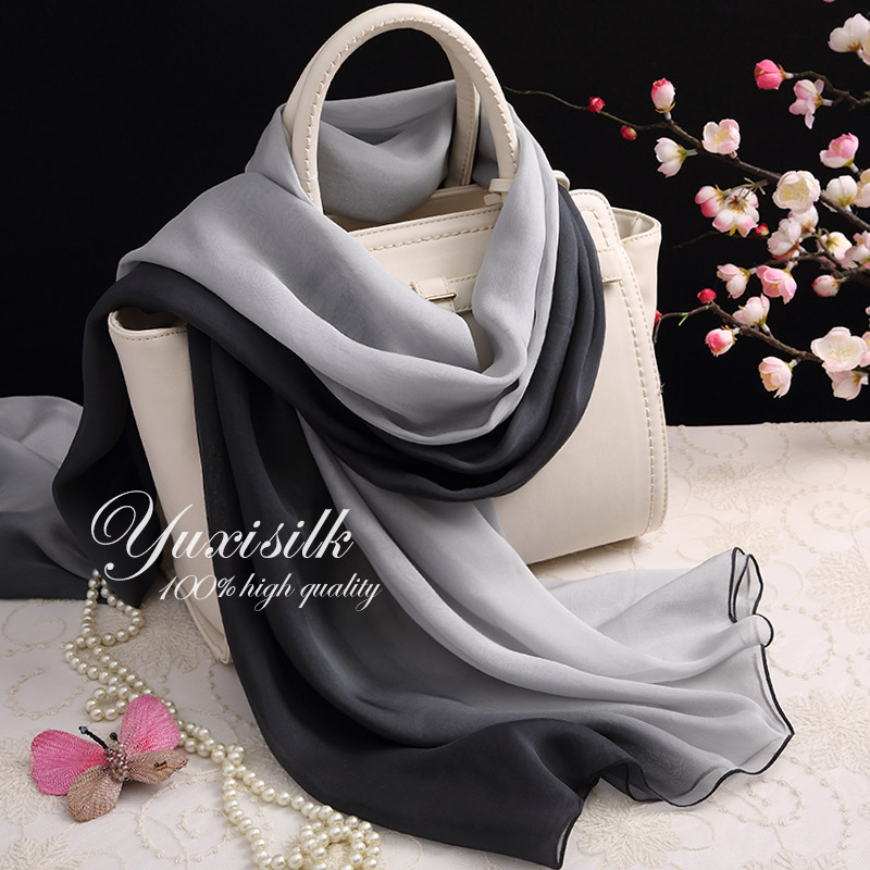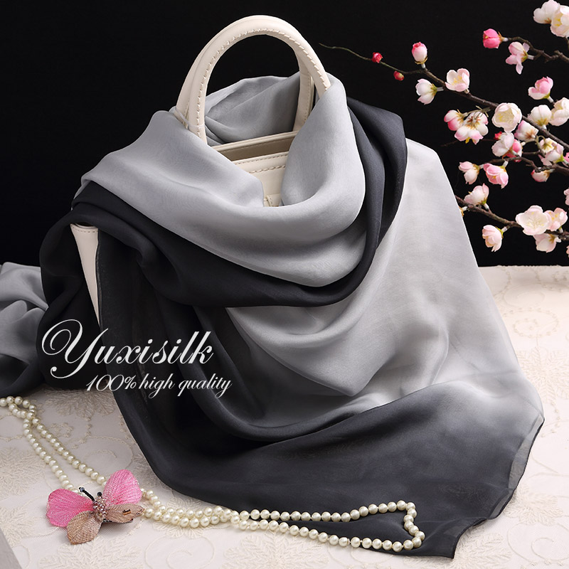 天猫黑灰渐变色100%桑蚕丝长款真丝丝巾围巾女纱巾披肩春秋冬夏季百搭