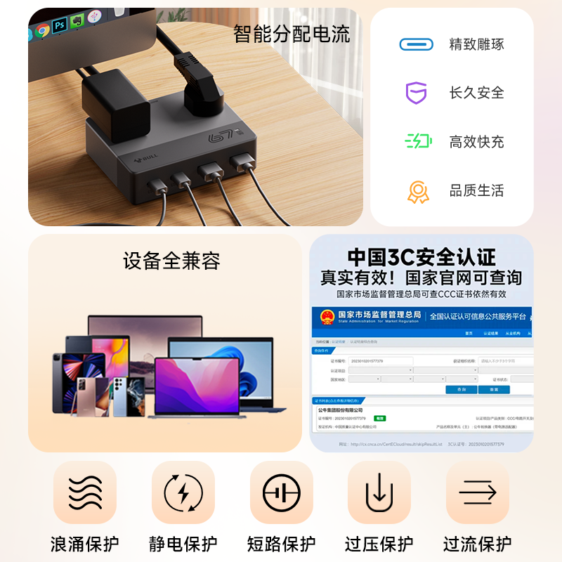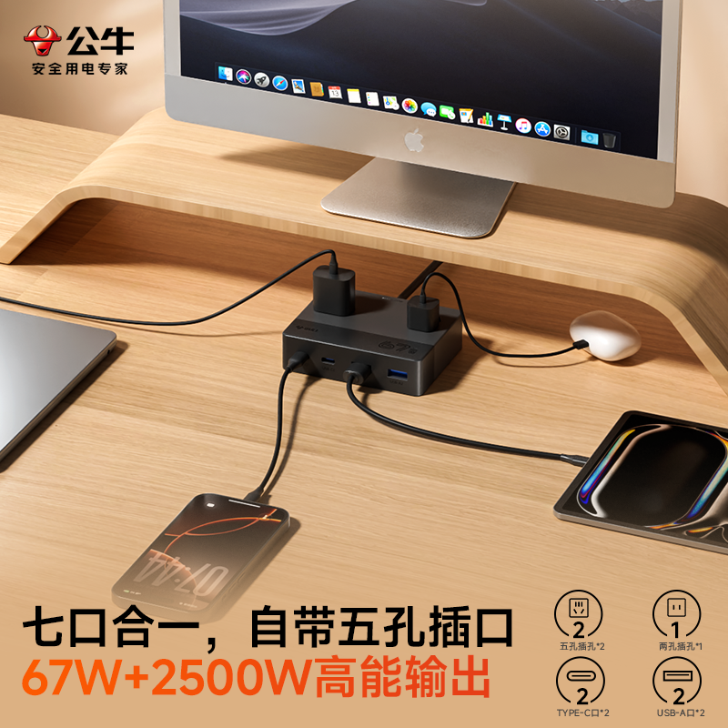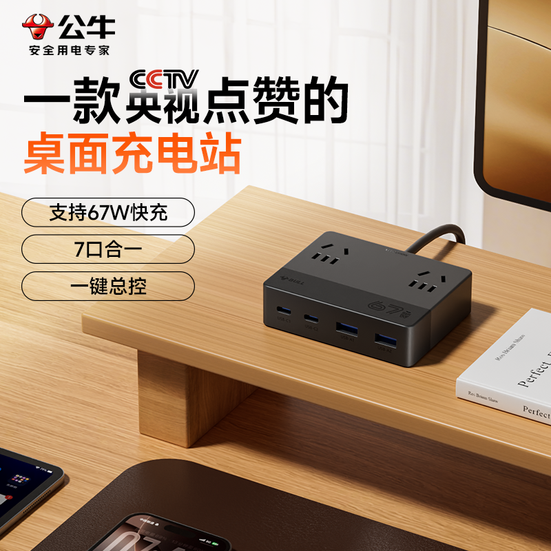 天猫公牛桌面充电站多口USB充电器快充插排充电头67W带typec多功能插座延长线多口手机快充接线板电脑电源拓展坞