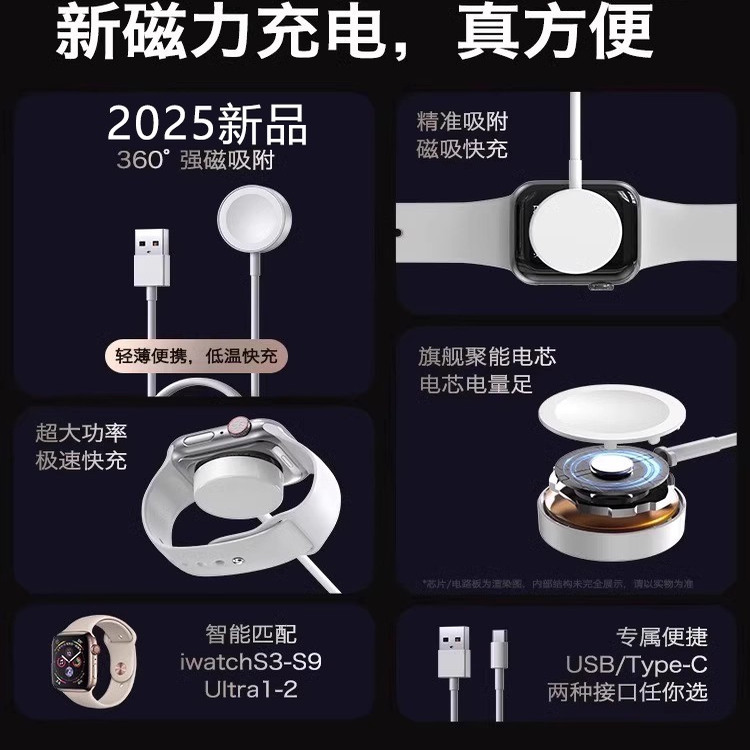 能适手表无线充电器磁吸数据线适用苹果小米15华为快充iwatch9 车载三合一type-c手表lightning一拖三 充电线