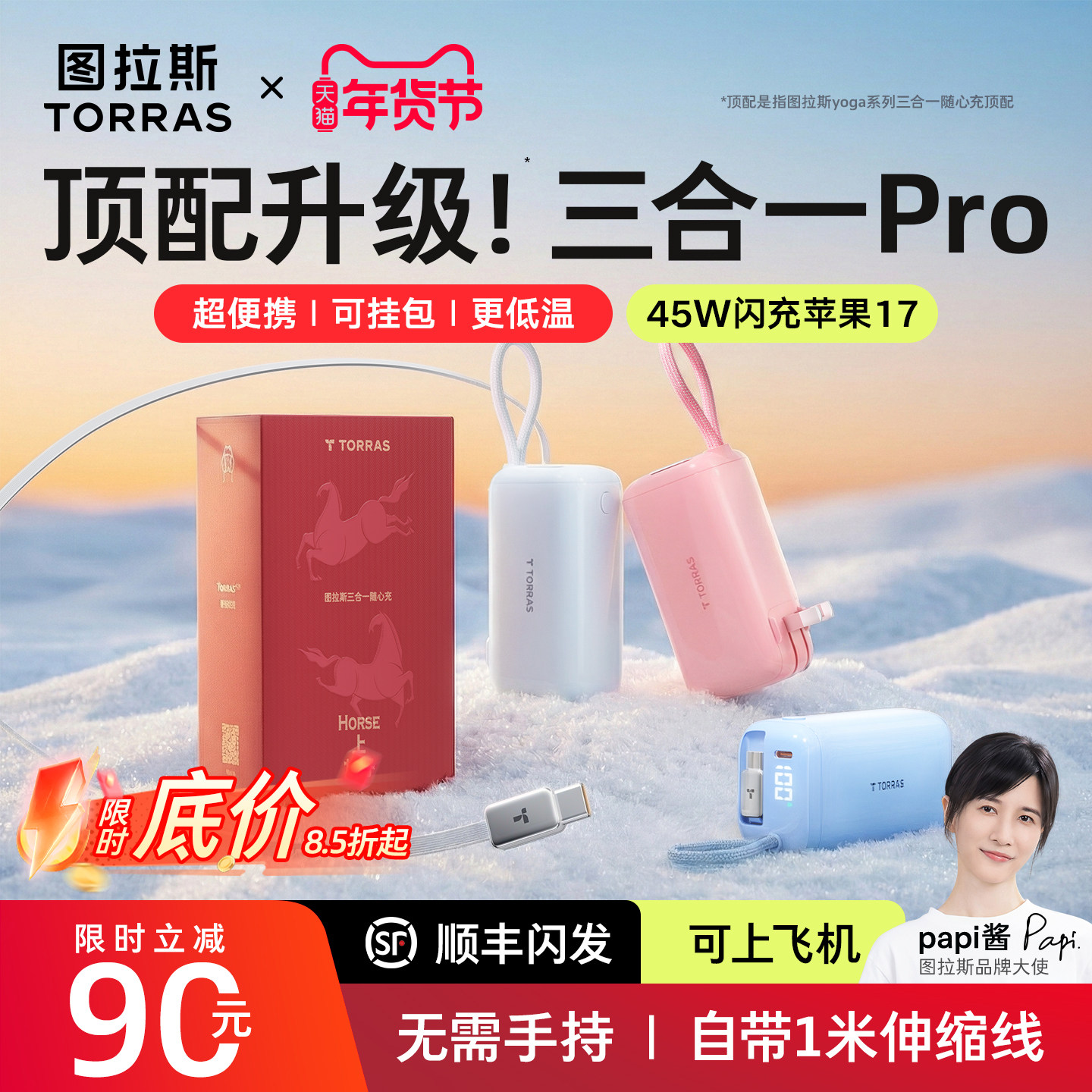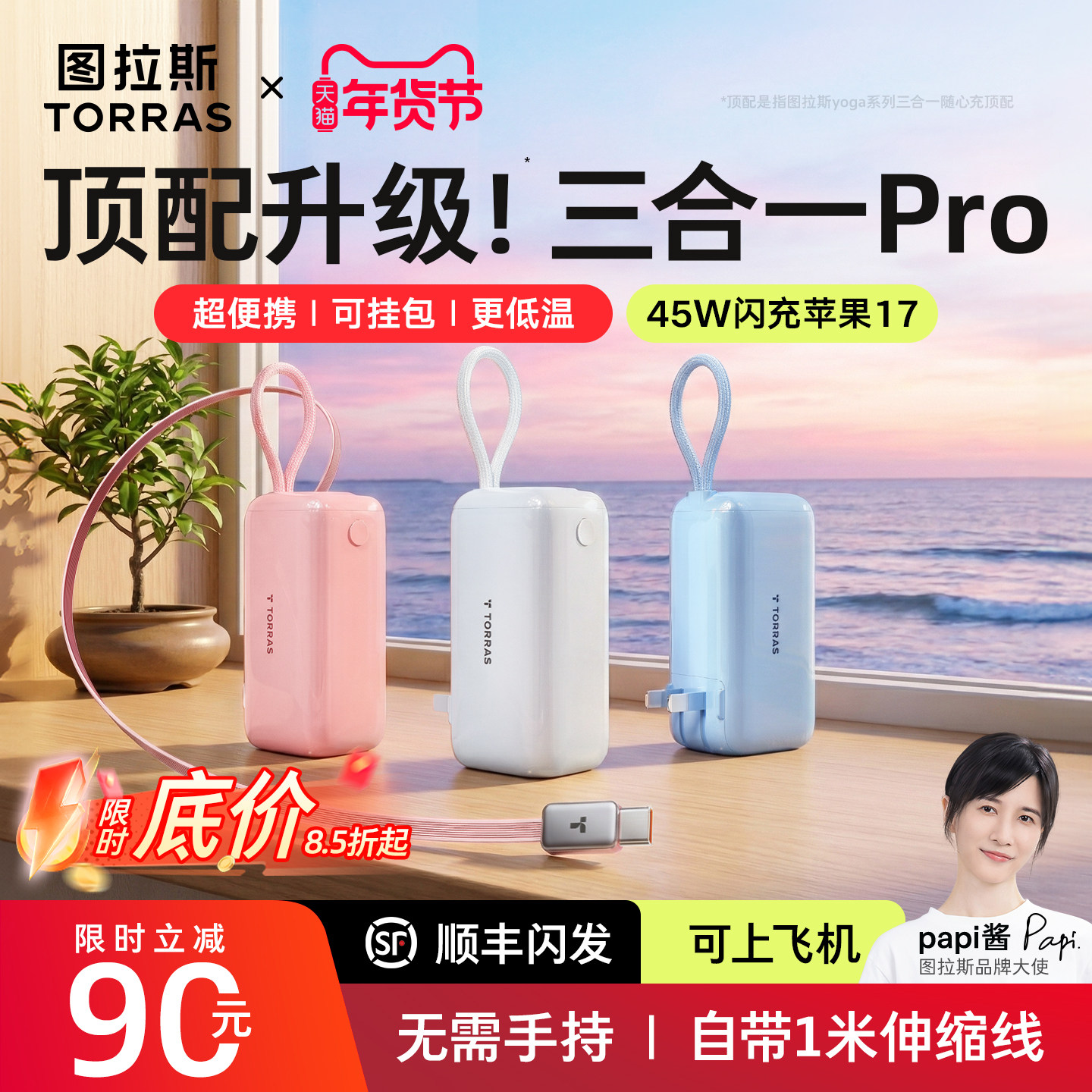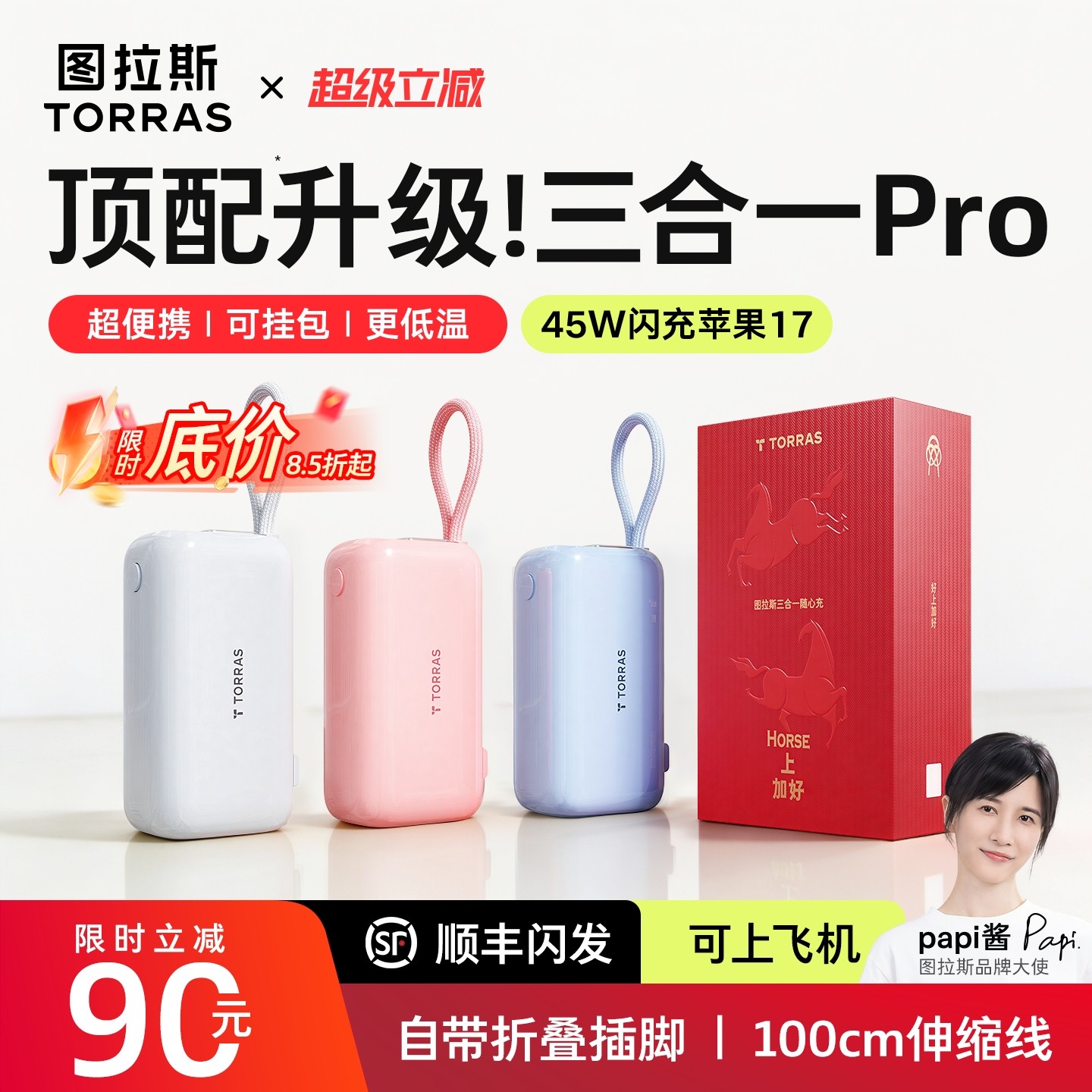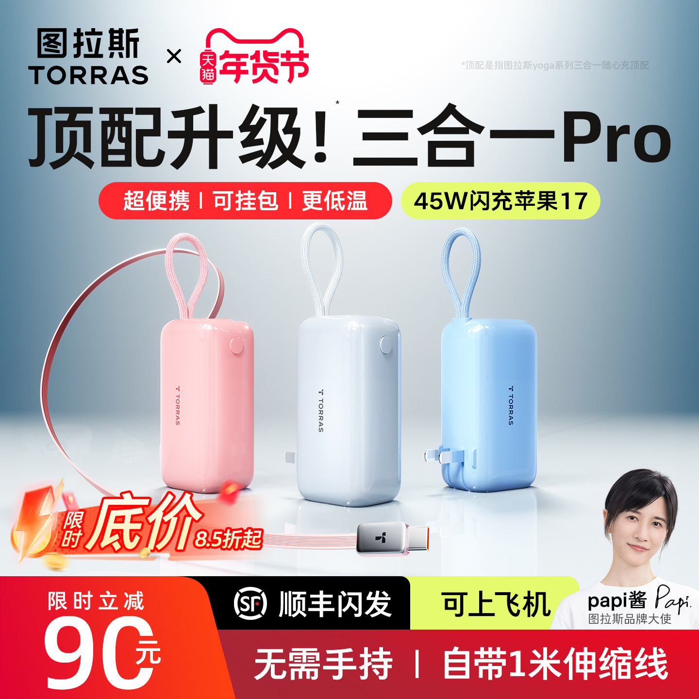 【Papi酱同款】图拉斯三合一Pro随心充,2026新款移动电源,集颜值与实力于一身!通过国家3C认证,安全可靠,可安心携带登机。自带三合一充电线(Lightning/Type-C/Micro-USB),兼容苹果、安卓等多设备,告别线材缠绕烦恼。支持45W大功率快充,专为iPhone 15/16系列优化,30分钟可为iPhone充至60%。内置高密度电芯,容量足、体积小,便携如能量棒。智能数显屏实时显示电量,多重安全防护,充电更安心。无论是出差、旅行还是日常通勤,图拉斯三合一Pro都是你的随身充电好搭档,高效、便捷、时尚,一“棒”搞定!