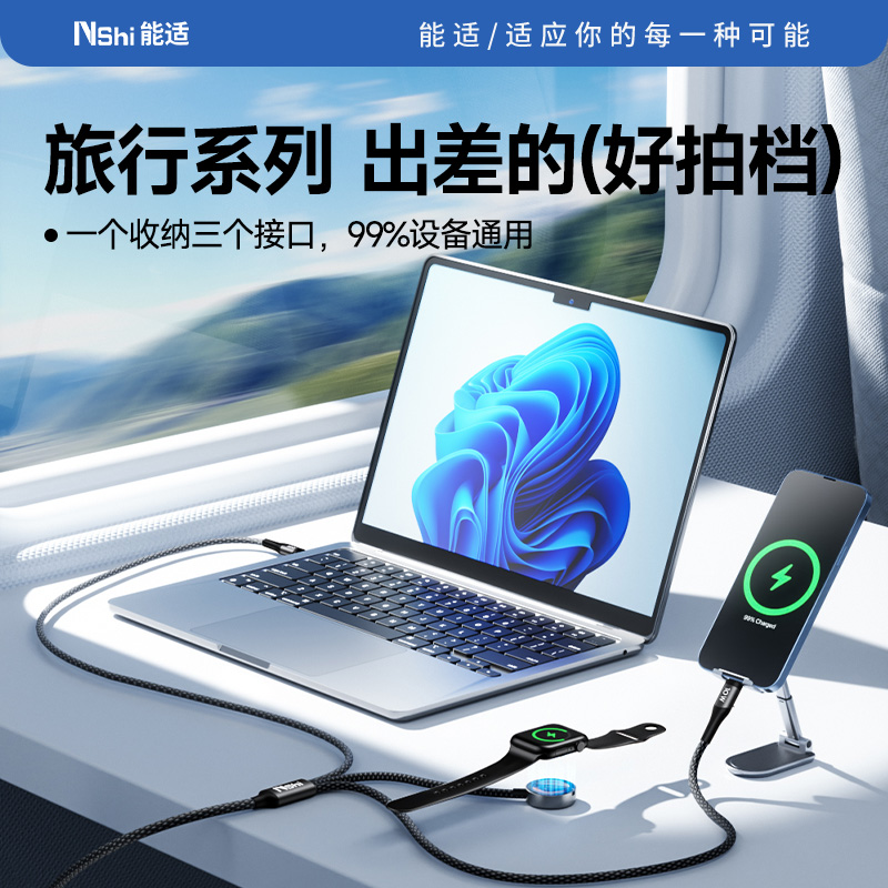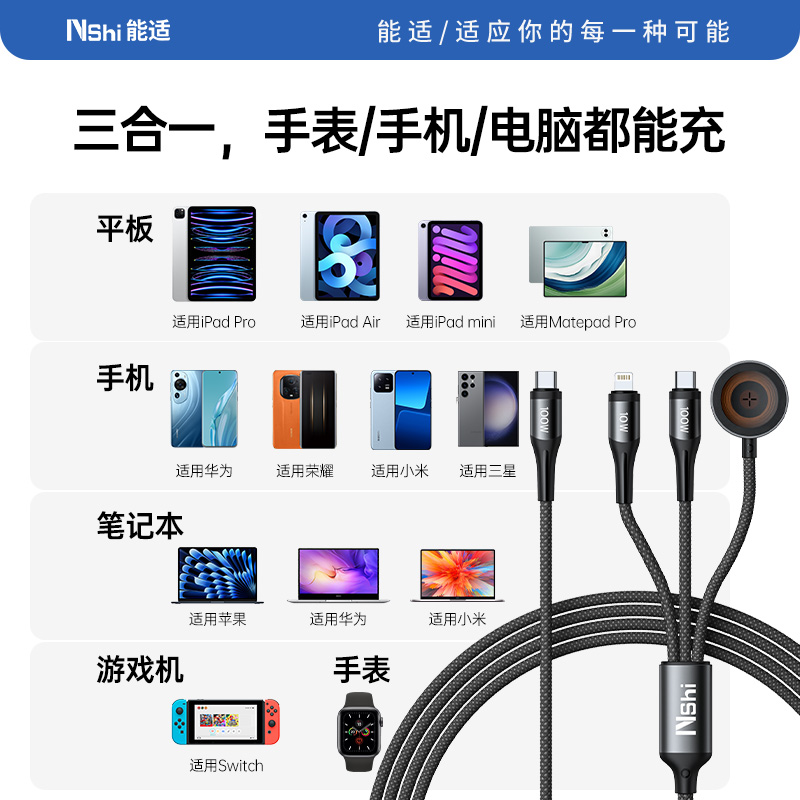 天猫能适手表磁吸数据线无线充电器适用苹果小米15华为快充iwatch9 车载三合一type-c手表lightning一拖三 充电线