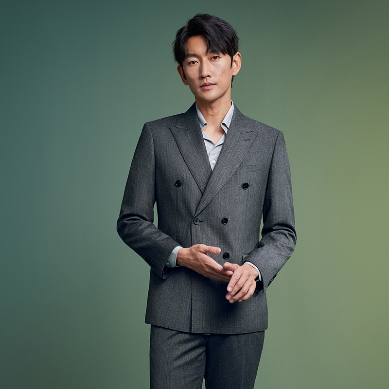 天猫澳嘉高支羊毛西服套装男士商务正装灰色双排扣结婚礼服男西装