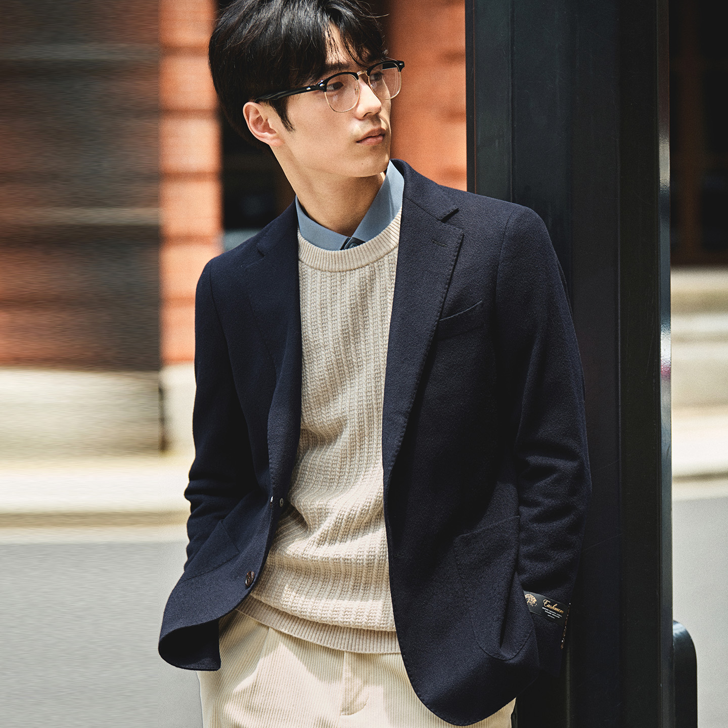 【1881意大利面料】丝麻羊毛混纺休闲蓝色格纹手工西服男薄款西装