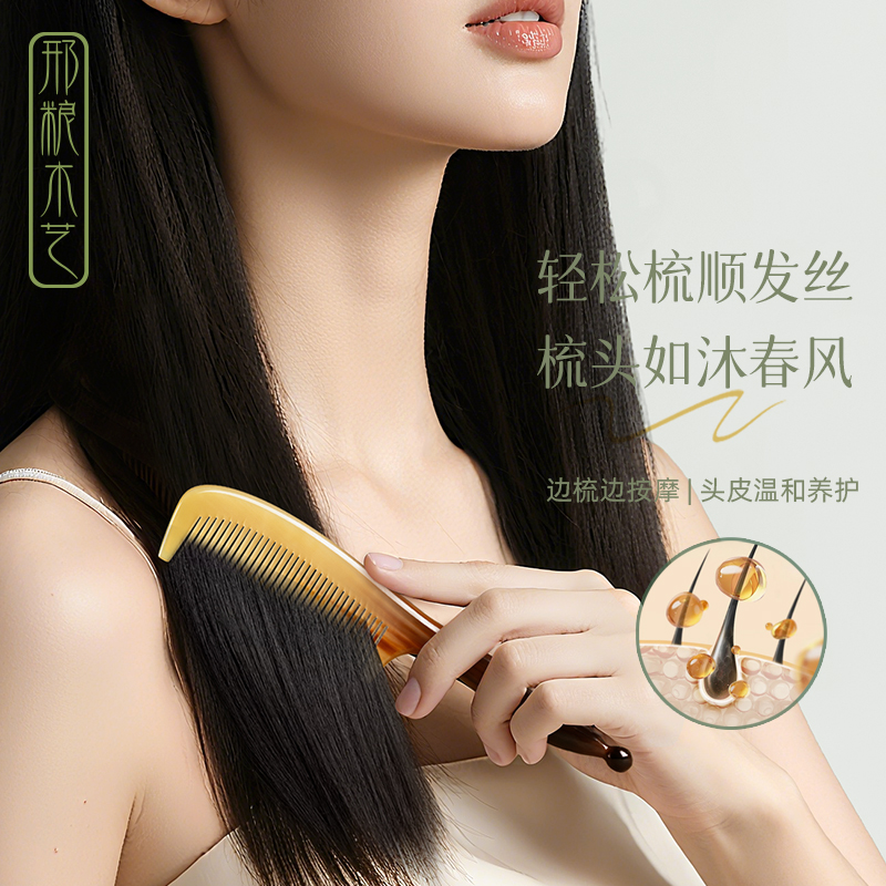 天猫邢粮木艺非遗牦牛角月泷柄梳子正品点穴按摩头部专用按摩密齿家用