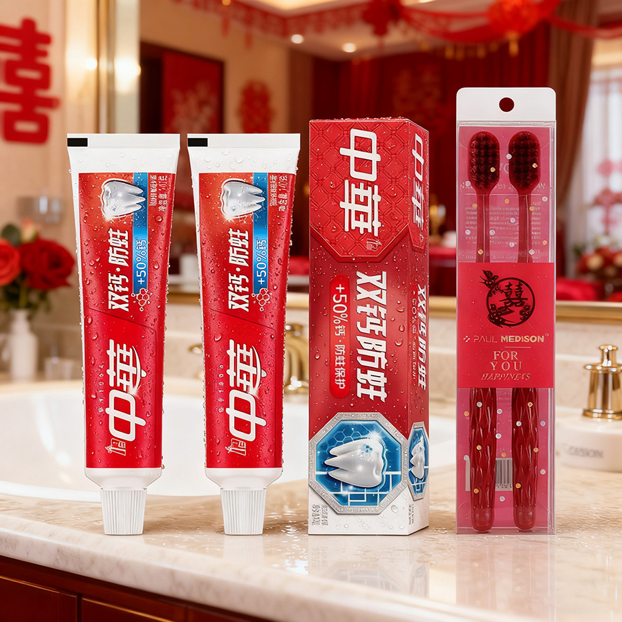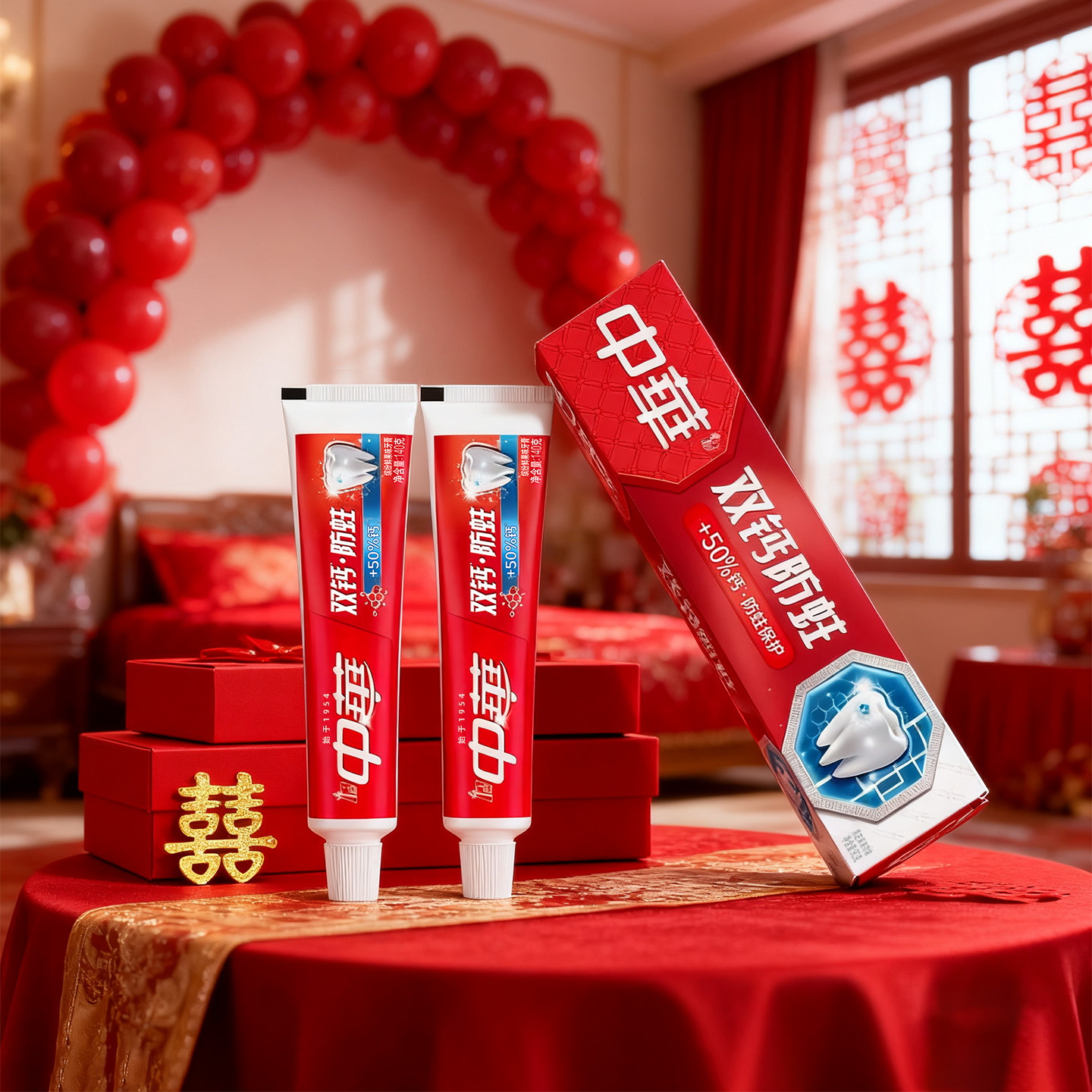 中华双钙防蛀牙膏,结婚喜庆红色牙刷包装,专为家庭设计。老牌子信誉卓越,去口臭效果显著。采用特殊防蛀技术,有效保护牙齿健康。一对装,性价比高,适合家庭日常使用。陪嫁佳品,让您的婚礼更加完美。优质成分,温和配方,呵护口腔健康。每支140g,便携易用,是您日常口腔护理的贴心伴侣。信赖中华品质,给您和家人口腔健康全方位保护。