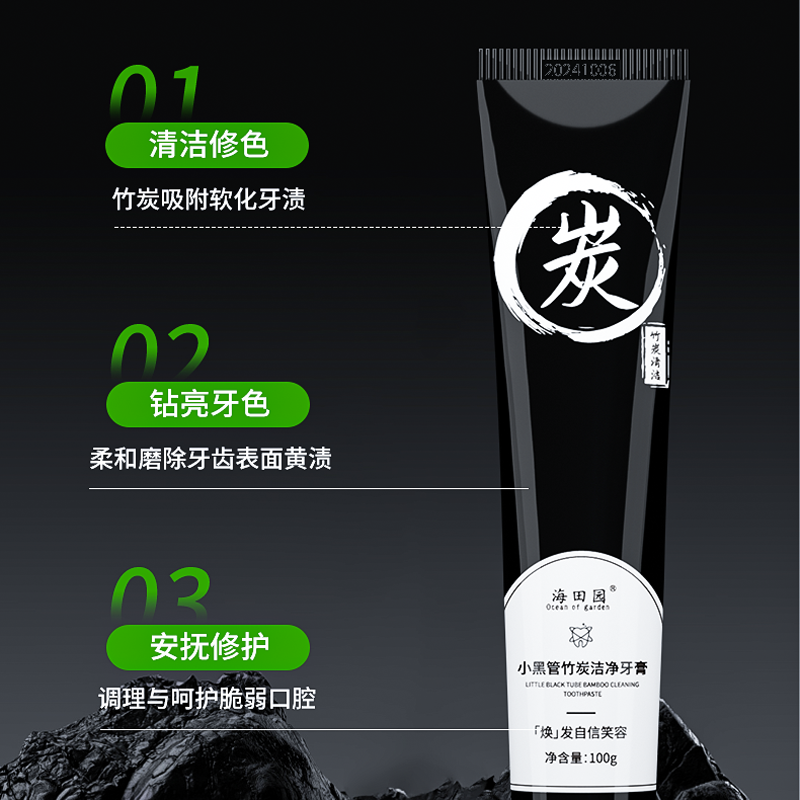 海田园小黑管竹炭洁净牙膏是一款高效清洁口腔的优质产品。采用竹炭深层清洁技术,有效去除牙齿表面的牙黄和牙渍,令牙齿焕发自然亮白。使用后可让口腔感到清爽舒适,预防口腔异味,保持口气清新。该牙膏是官方正品,品质有保障。让你的笑容更加自信动人。每天使用,牙齿健康白皙有光彩。