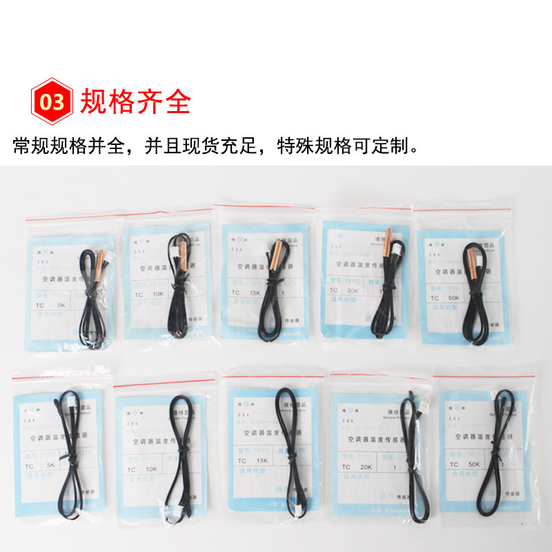 空调温度传感器(感温头)是空调系统中用于检测环境温度的关键元件,广泛应用于室内机和室外机中。常见的阻值规格包括5K、10K、15K、20K和50K,分别对应不同温度下的电阻值,以适应不同机型和控制需求。感温探头通过感知周围温度变化,将信号传递给主板,实现精准控温、启停压缩机及调节风速等功能。其材质多为热敏电阻(NTC),具有灵敏度高、响应快、稳定性好等特点。正确匹配感温头的阻值对空调正常运行至关重要,安装时需确保接触良好、避免受潮或受压。优质感温头能有效提升空调能效与使用寿命,保障舒适使用环境。