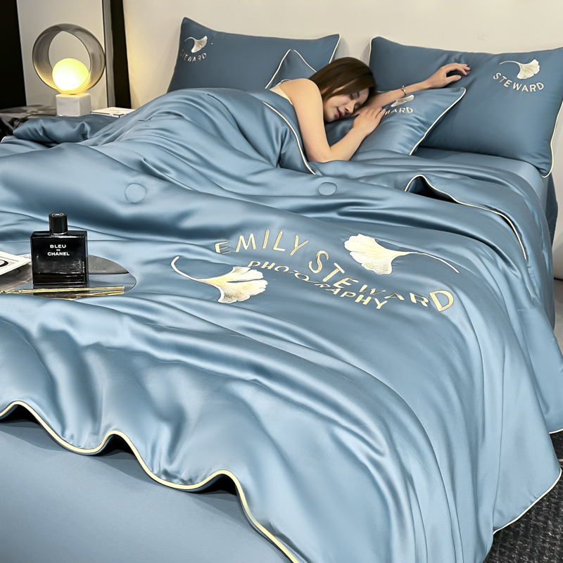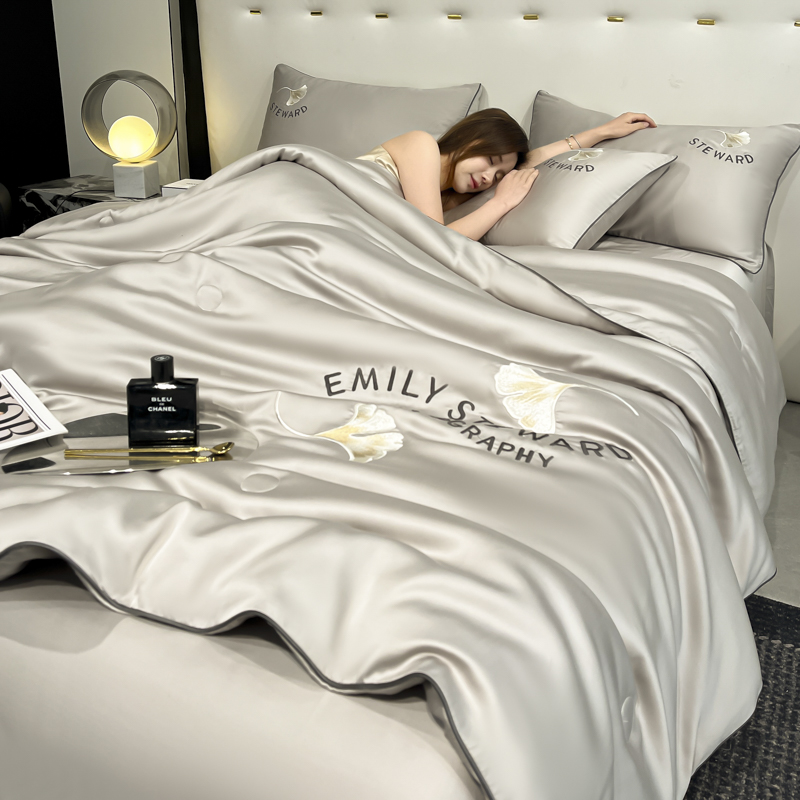 这款夏凉被四件套,专为夏日舒适打造。采用冰丝材质,轻薄透气,高级感十足。床笠设计,适用于单人或双人床,方便实用。无论是家用还是学生宿舍,都能轻松融入各种环境。该被子可配套空调使用,为您在炎炎夏日带来凉爽感受。简洁时尚,性价比高,是您夏天的理想选择。