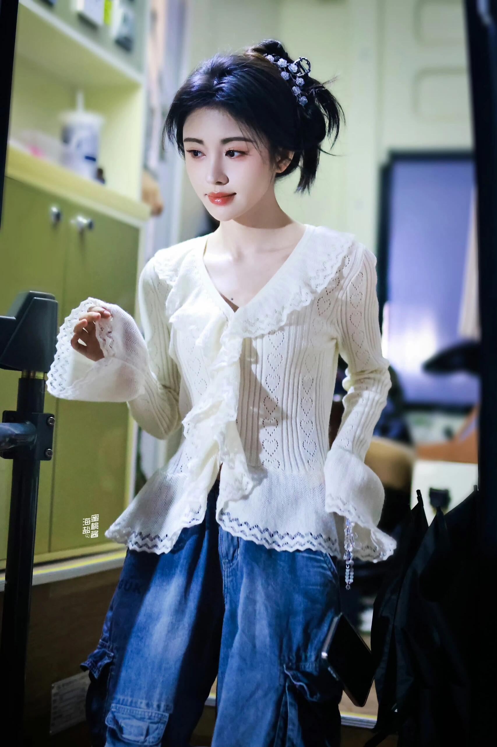 淘宝鞠婧祎白鹿明星同款荷叶边水袖针织衫女镂空长袖修身女士空调上衣