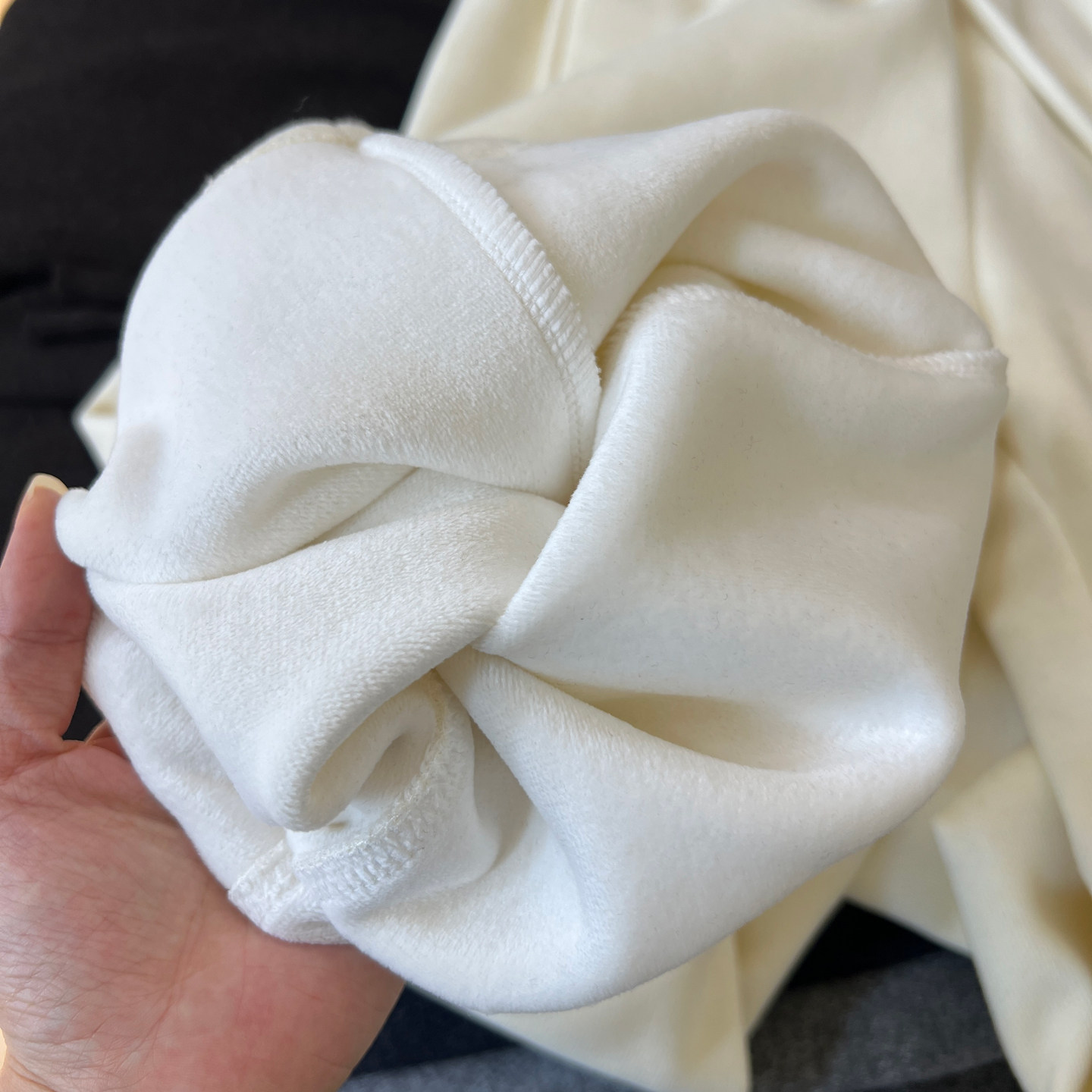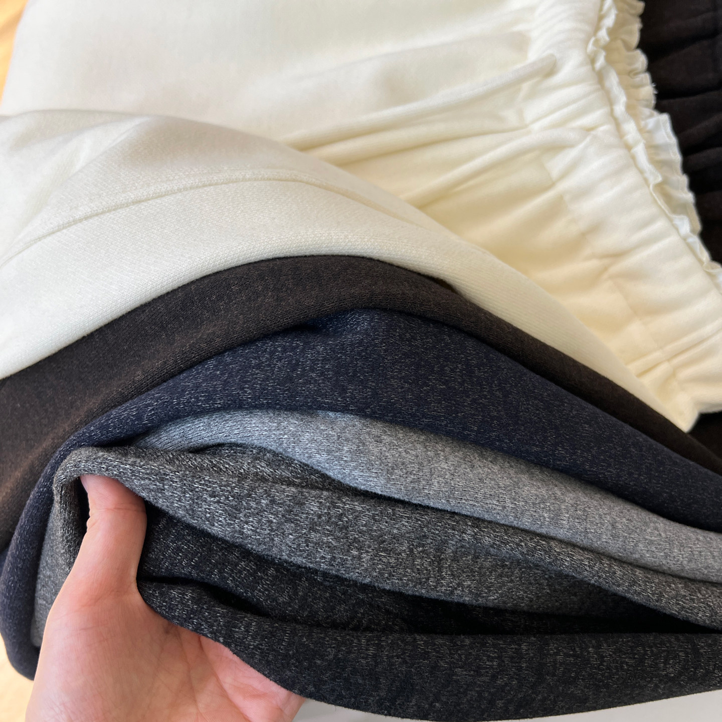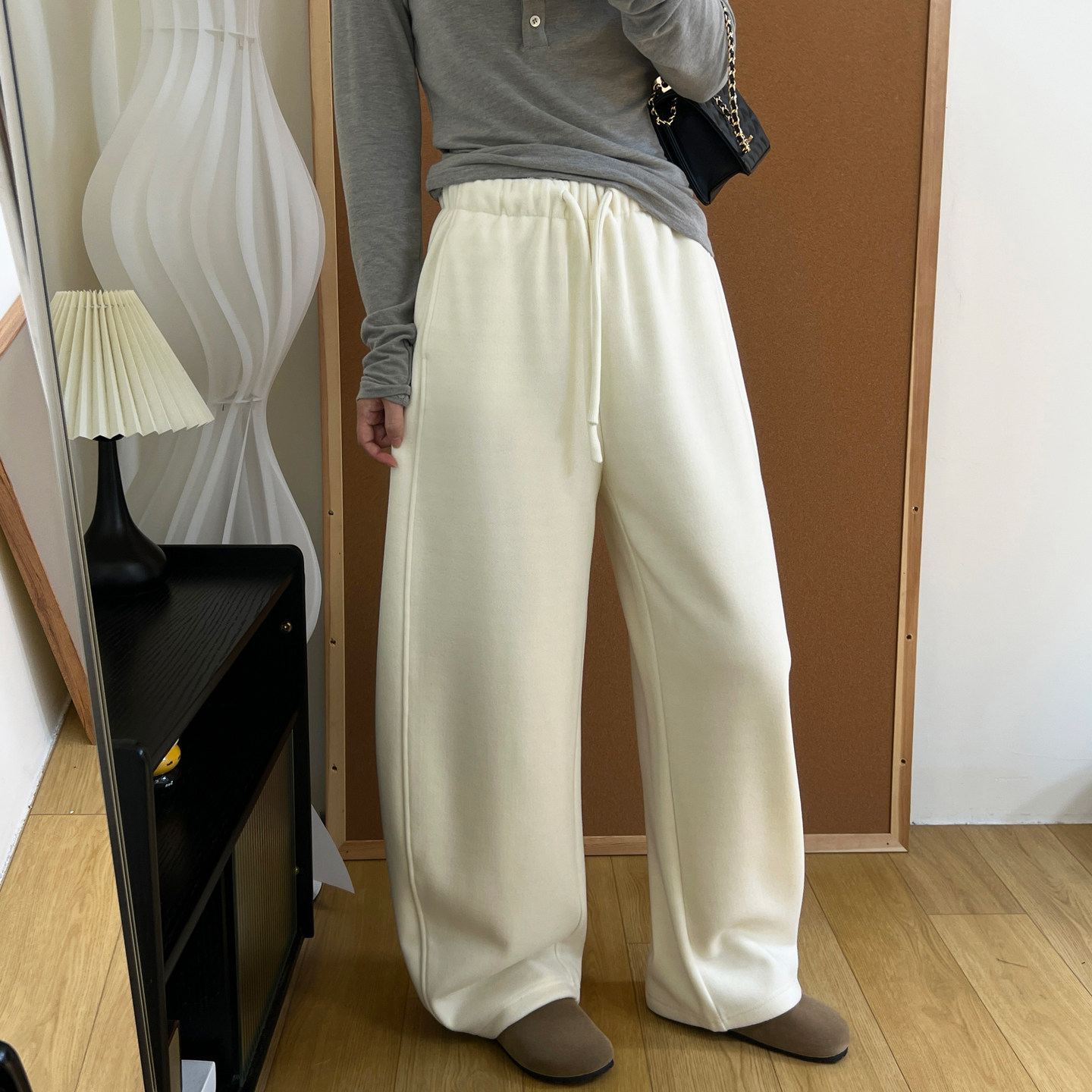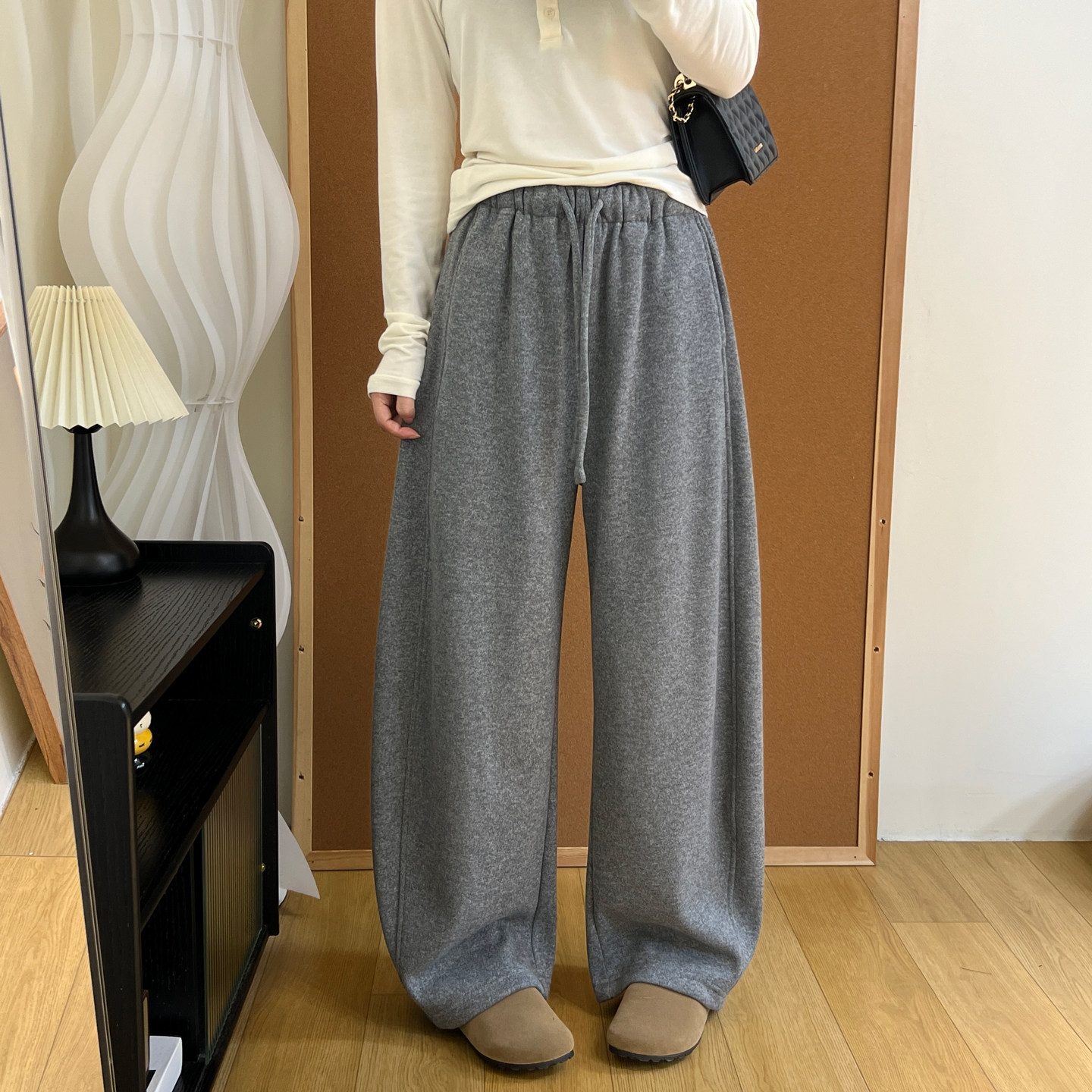 淘宝冬季加绒羊绒裤子女灰色高级感花边松紧腰宽松显瘦垂顺直筒阔腿裤