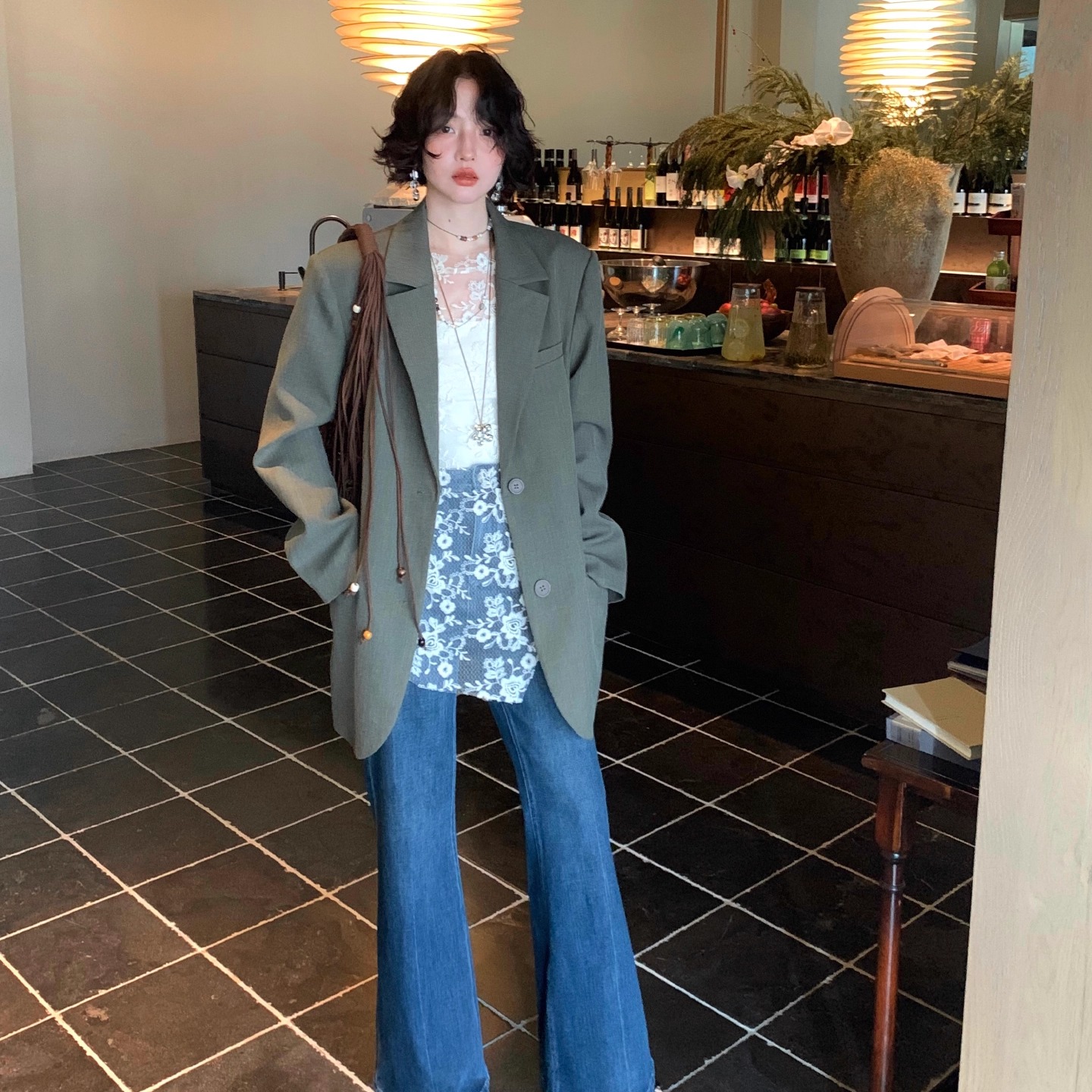 含莱赛尔 女士抓绒直筒微阔九分牛仔裤 加绒保暖休闲奶奶裤 冬k