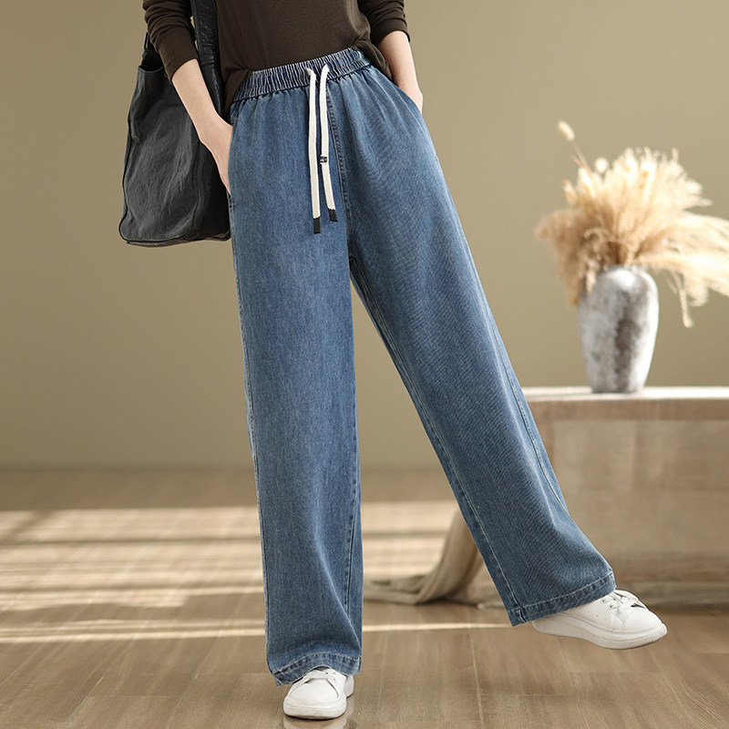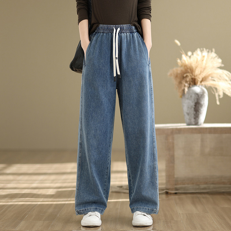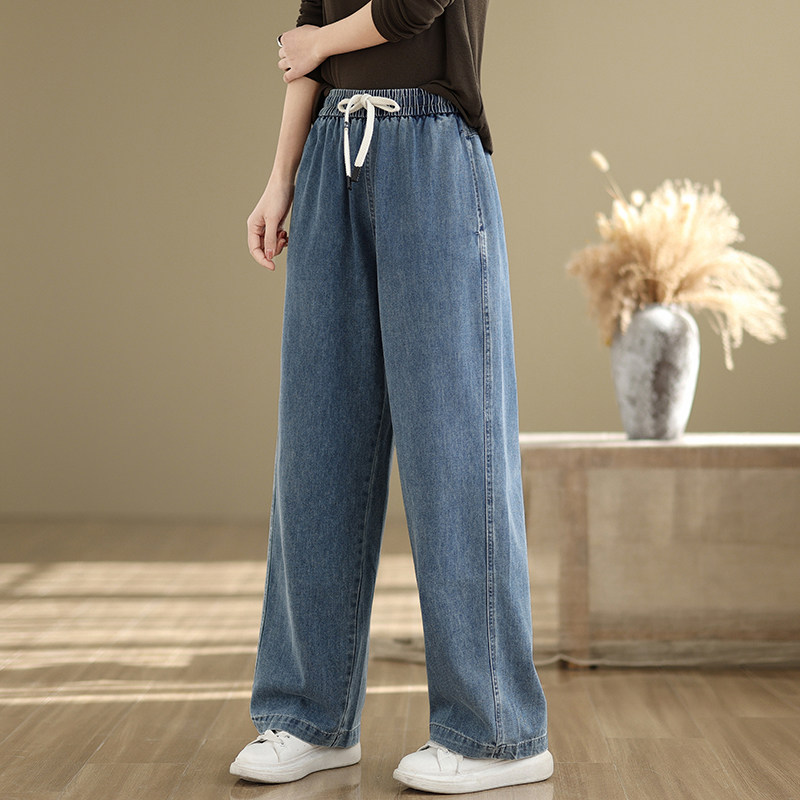 淘宝大码松紧腰抽绳牛仔裤女2025年新款春季小个子显高显瘦直筒阔腿裤