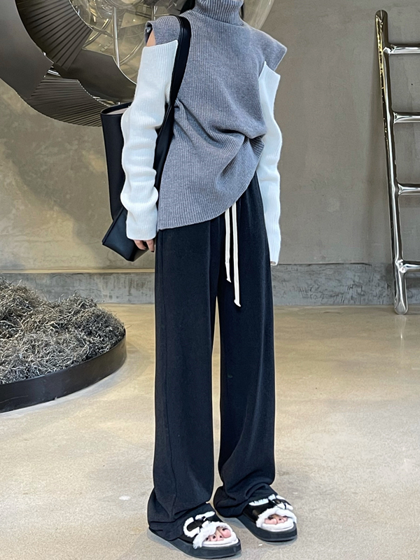 淘乐库优绵羊毛直筒裤女秋冬高腰垂感加绒加厚挺括休闲拼接阔腿裤子