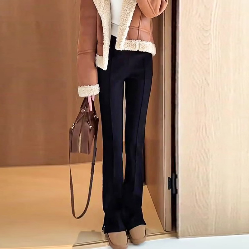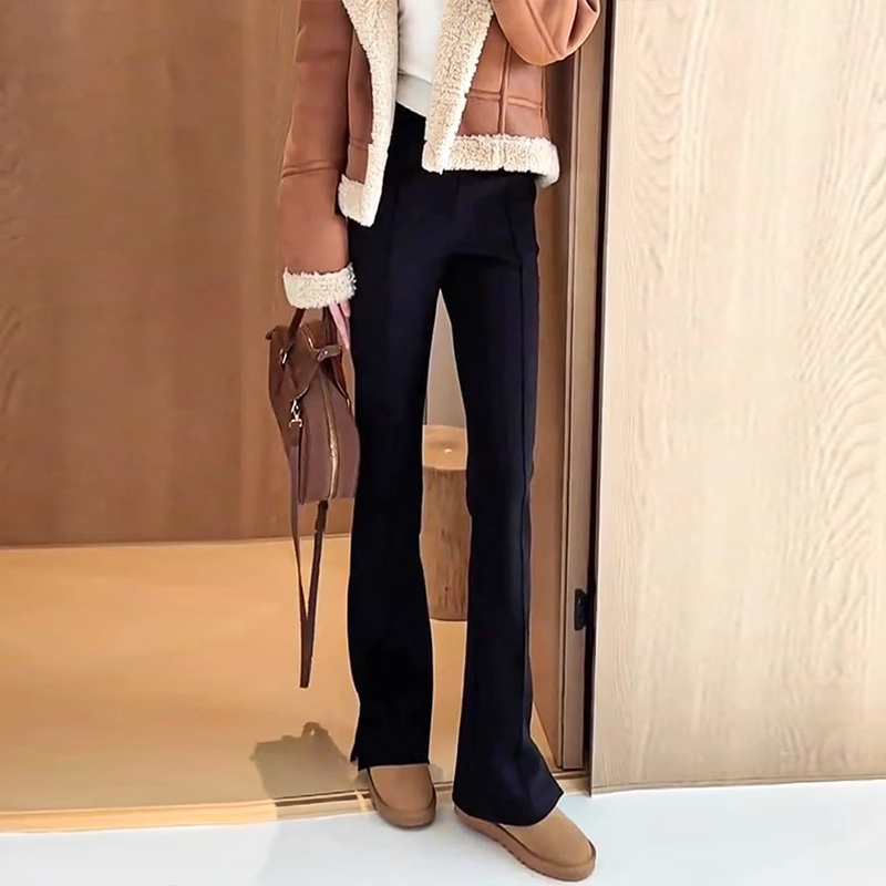 这款黑色侧开叉微喇叭裤是2025秋冬新款,专为女性设计。裤子采用高腰设计,垂感极佳,展现出优美的线条。加绒内衬保暖舒适,适合秋冬季节穿着。微喇叭裤型展现时尚潮流,侧开叉设计为腿部增添动感。直筒休闲西装裤款式,既适合正式场合的穿着,也适合日常休闲搭配。黑色经典百搭,可搭配各种风格的服饰。无论是搭配高跟鞋还是运动鞋,都能展现出不同的时尚魅力。是一款集时尚、舒适、实用于一身的优质女装裤。