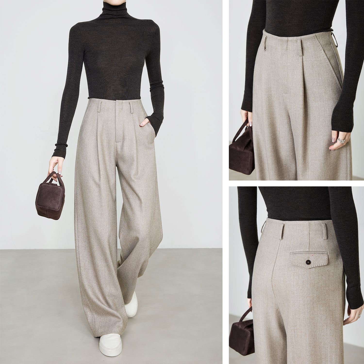 乐库优绵羊毛直筒裤女秋冬高腰垂感加绒加厚挺括休闲拼接阔腿裤子