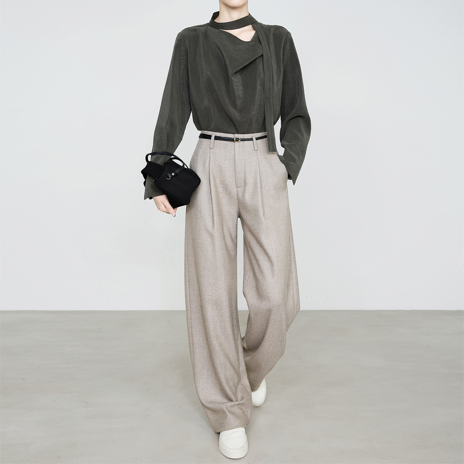 天猫夏莫卡老钱风燕麦色直筒裤女2025羊毛西装裤显瘦天丝阔腿裤秋9735