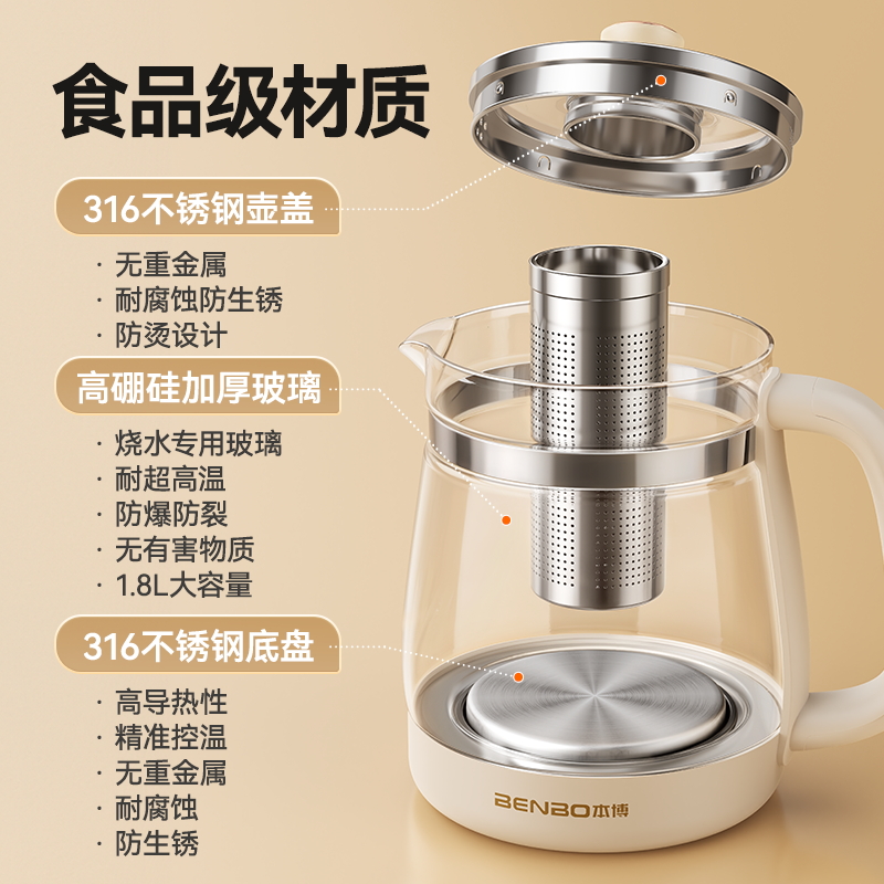 本博养生壶是一款专为现代生活设计的实用家居电器。这款烧水炖煮一体的多功能玻璃煮茶器,不仅适用于家庭使用,也适合办公室使用。其小巧的体积,方便携带,功能多样,操作简单。采用玻璃材质,烹饪过程一目了然,确保食品安全与卫生。2025新款设计更加人性化,既满足健康养生的需求,又兼顾便捷性。无论是泡茶、煮咖啡还是炖汤,本博养生壶都能轻松应对,让您的生活更加健康、舒适。