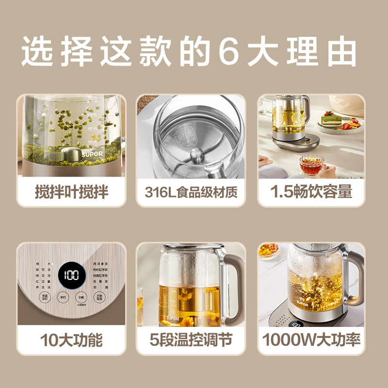 天猫苏泊尔搅拌养生壶316L不锈钢家用玻璃花茶多功能自动煮茶器办公室