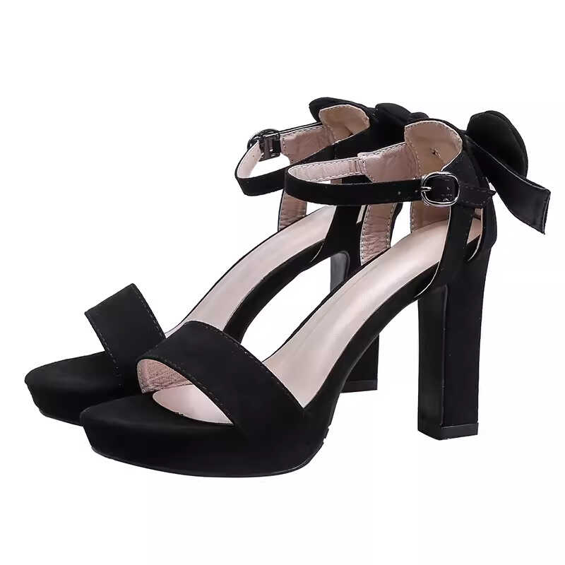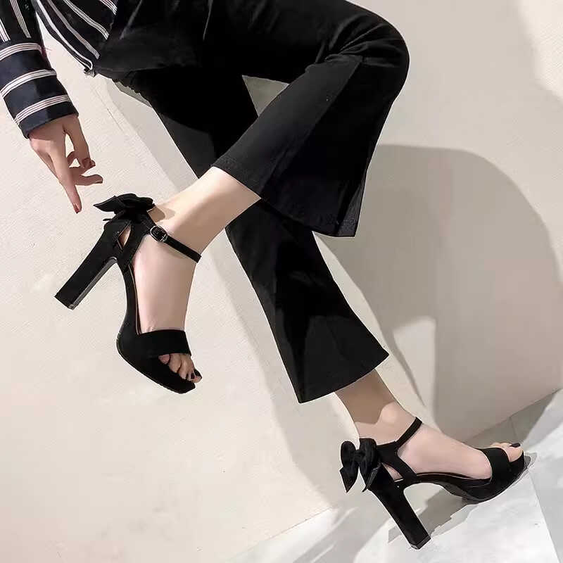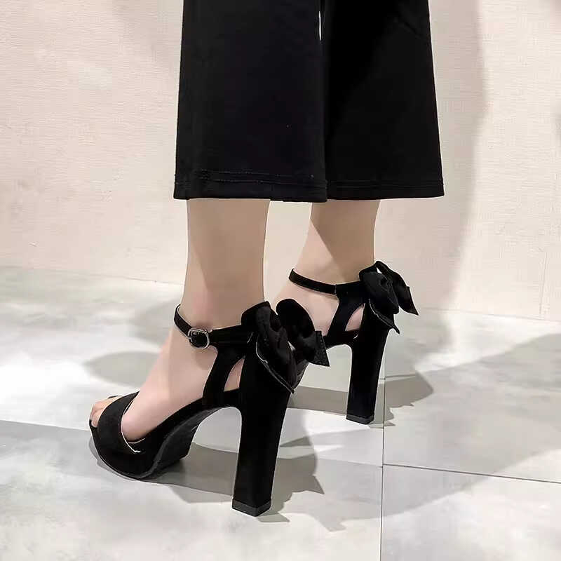 淘宝一字扣带粗跟凉鞋女10cm超高跟女鞋后蝴蝶结防水台露趾模特走秀鞋