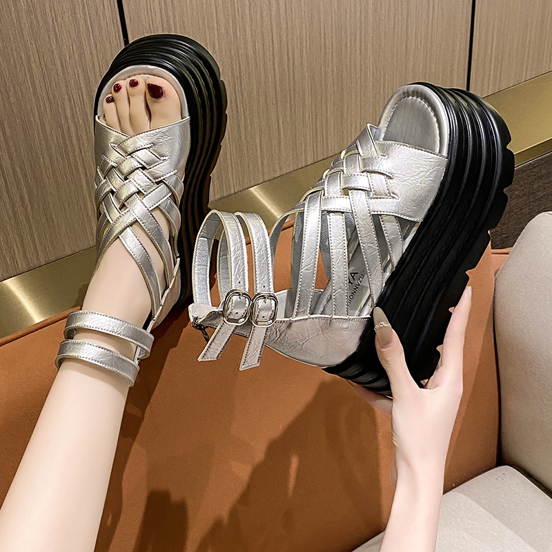 淘宝松糕厚底凉鞋女款夏季2025新款复古小个子增高跟真皮镂空罗马凉靴