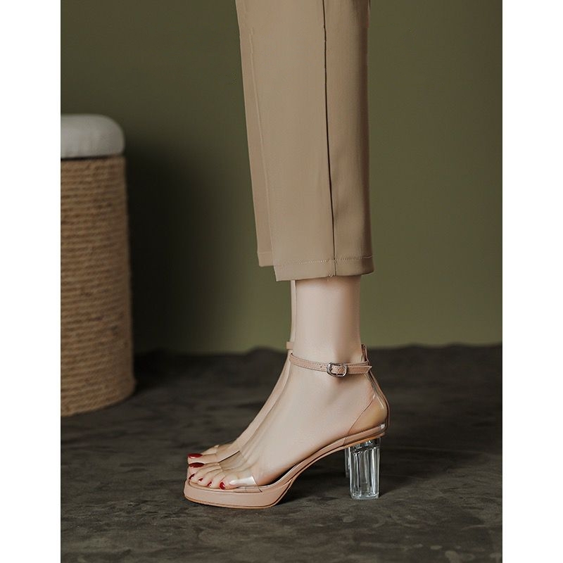 淘透明凉鞋女夏季新款百搭一字扣带露趾中跟气质水晶鞋网红粗高跟鞋