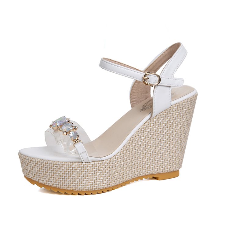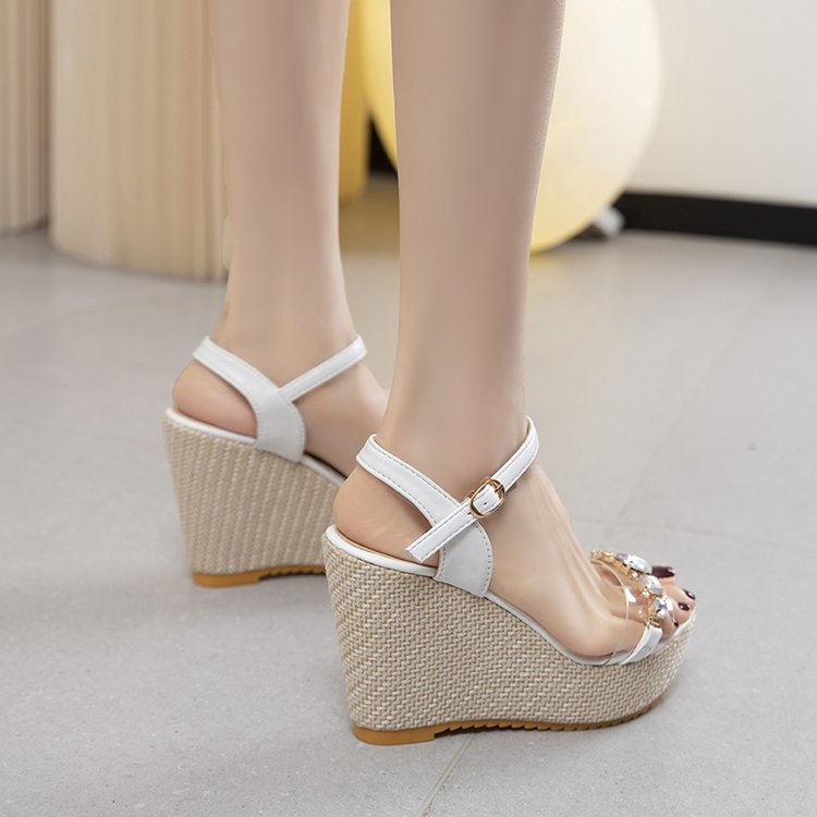 淘宝温柔婚鞋凉鞋女夏2023新款仙女风高跟坡跟防水台厚底一字带罗马鞋