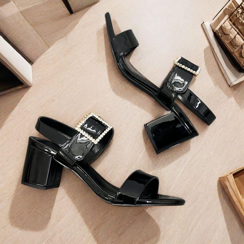 淘宝2025夏季外贸新款简约一字带水钻搭扣高跟凉鞋女粗跟露趾优雅女鞋