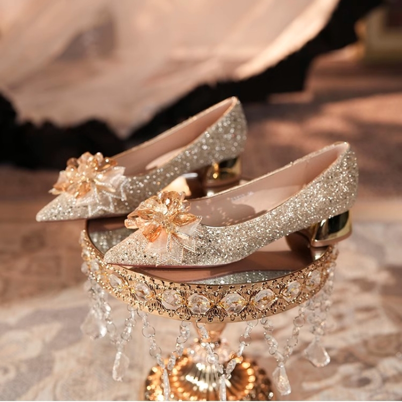 淘黑色高级感高跟鞋女珍珠脚环蝴蝶结水晶婚鞋细跟尖头18岁成人礼服