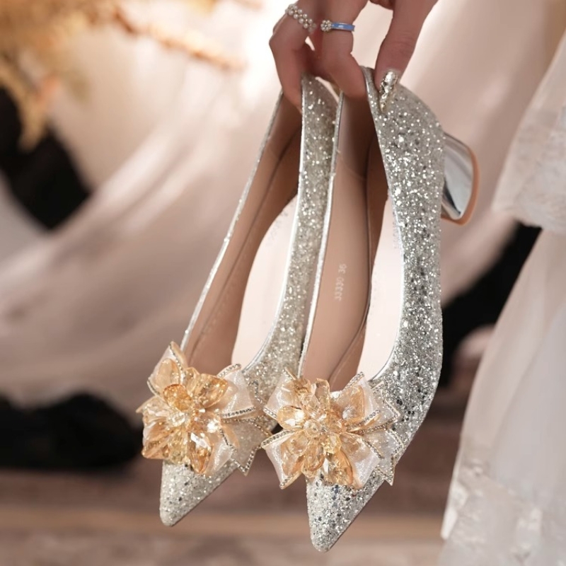 黑色高级感高跟鞋女珍珠脚环蝴蝶结水晶婚鞋细跟尖头18岁成人礼服