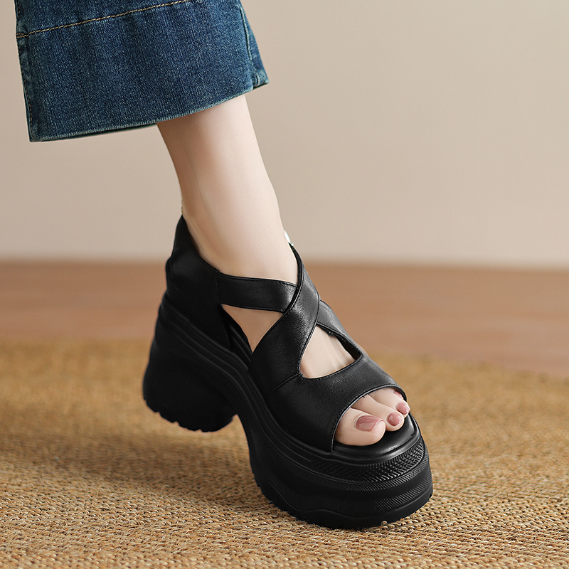 淘宝夏季新款12cm内增高女鞋真皮镂空鱼嘴坡跟凉鞋洋气时尚超高跟单鞋