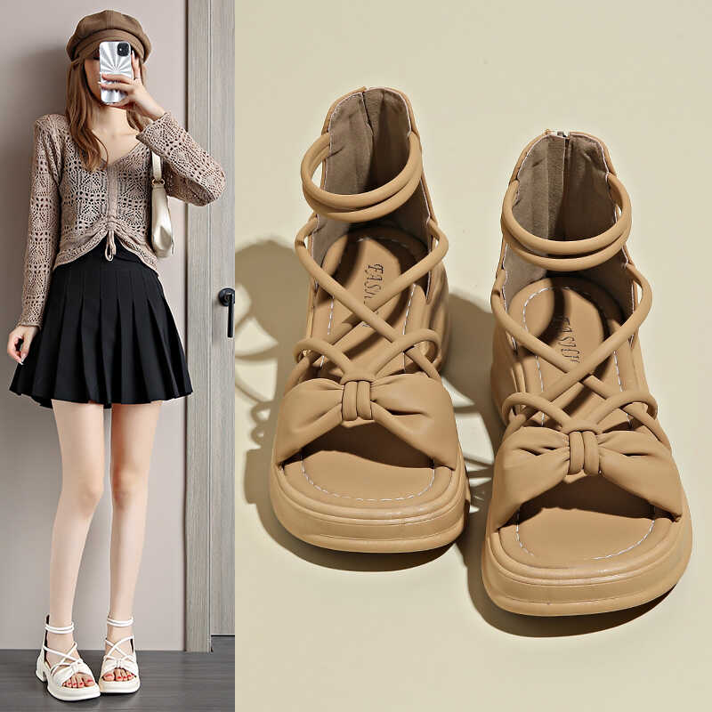 真皮坡跟凉鞋白色松糕鱼嘴鞋高跟防水台厚底鞋防滑大码舒适夏季鞋