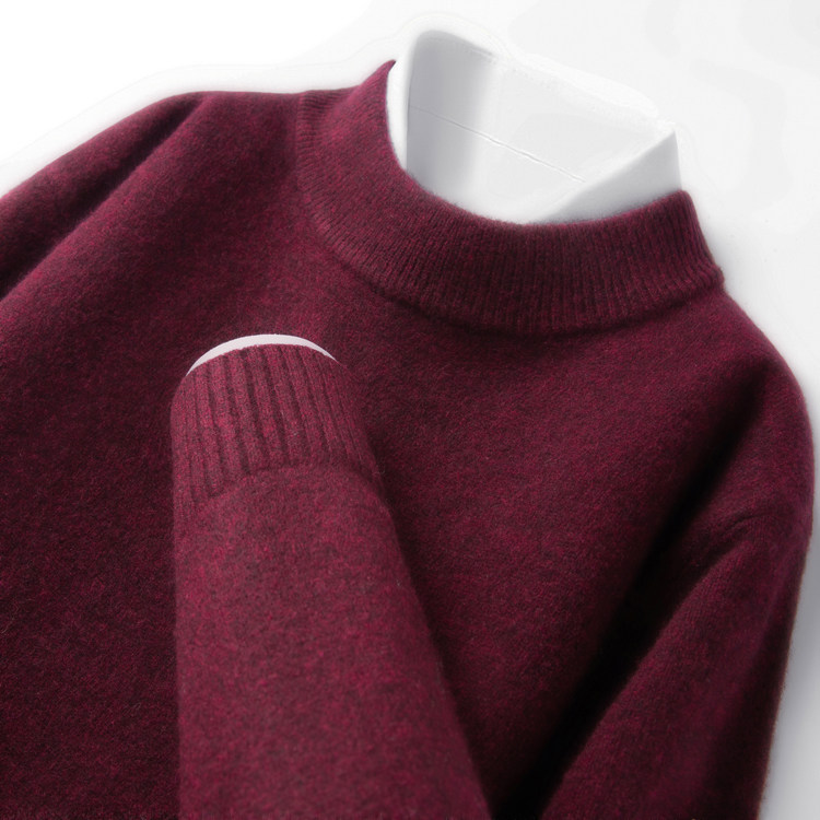 淘秋冬保暖圆领羊绒衫男士百搭打底针织毛衣本命年内搭酒红色羊毛衫