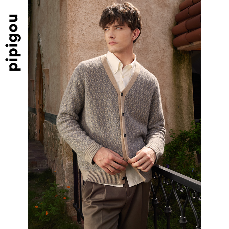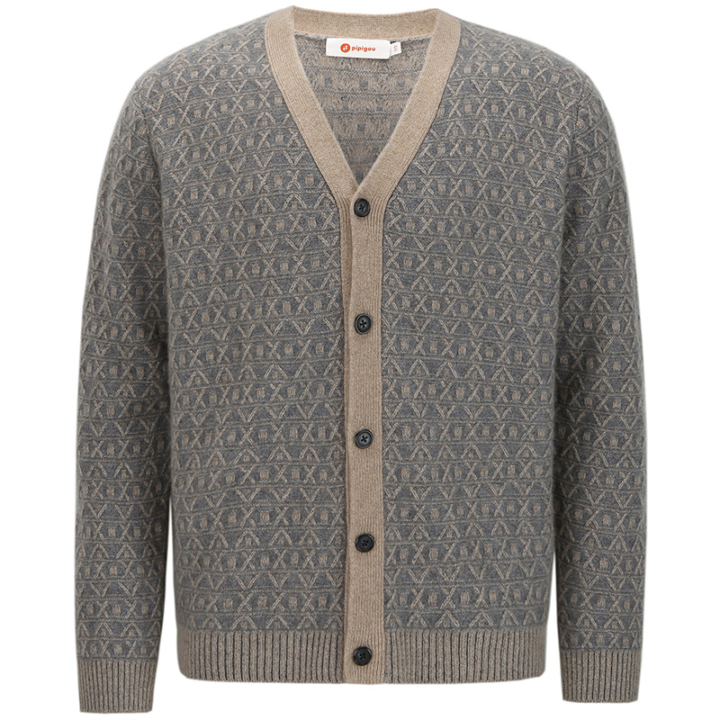 天猫皮皮狗新款V领几何提花无染色羊绒撞色加厚男士羊绒针织开衫外套
