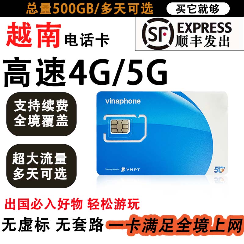 天猫越南电话卡vinaphone5G/4G手机高速流量上网卡全境通用芽庄胡志明