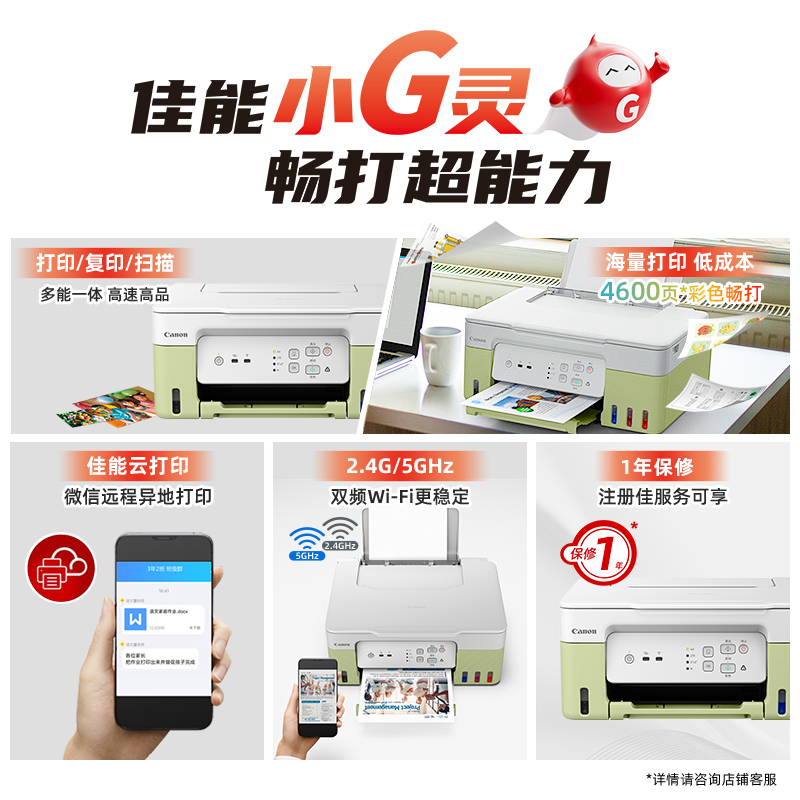 佳能旗舰店推出的G3833/3831/3836原装加墨彩色A4喷墨打印机一体机,是办公和家用的理想选择。该打印机支持A4纸张打印,具备彩色打印功能,可呈现出清晰、生动的图文效果。此外,它还支持复印和扫描功能,可以满足日常办公的各种需求。更重要的是,该打印机支持5GWIFI连接,手机远程操控,让您随时随地完成打印任务。无论是打印文档还是照片,都能获得出色的打印效果。佳能旗舰店的这款打印机,是您高效办公、便捷生活的得力助手。