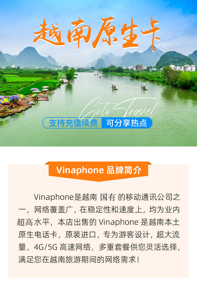 天猫越南电话卡vinaphone5G/4G手机流量高速上网卡全境通用芽庄胡志明