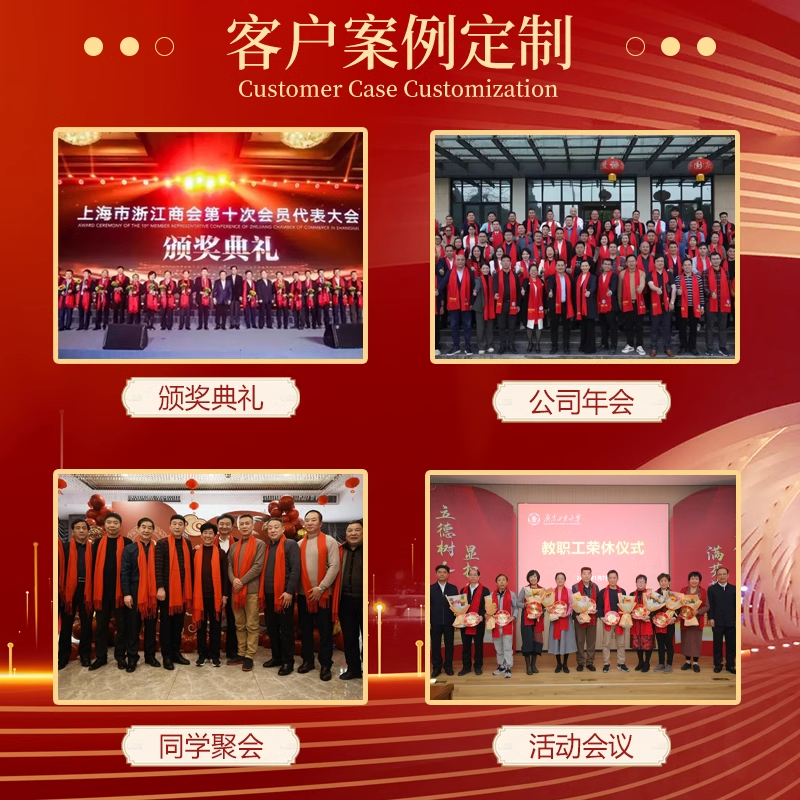 红围巾定制公司是一家专注于为客户提供个性化定制服务的公司,主要产品为高质量的中国大红色围巾。我们的服务涵盖公司年会庆典、开业活动以及同学聚会等不同场合的需求。围巾上可印上客户的logo字样,展示个性与独特风格。采用优质材料制作,保证舒适耐用的同时,展现中国传统的喜庆色彩。无论是作为礼品赠送,还是自用,都是优质之选。我们致力于满足客户的独特需求,以细致的服务和优质的产品赢得客户的信赖。