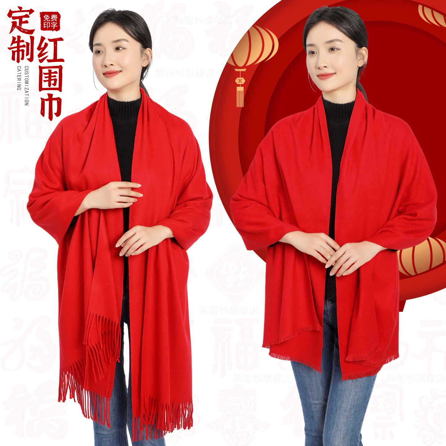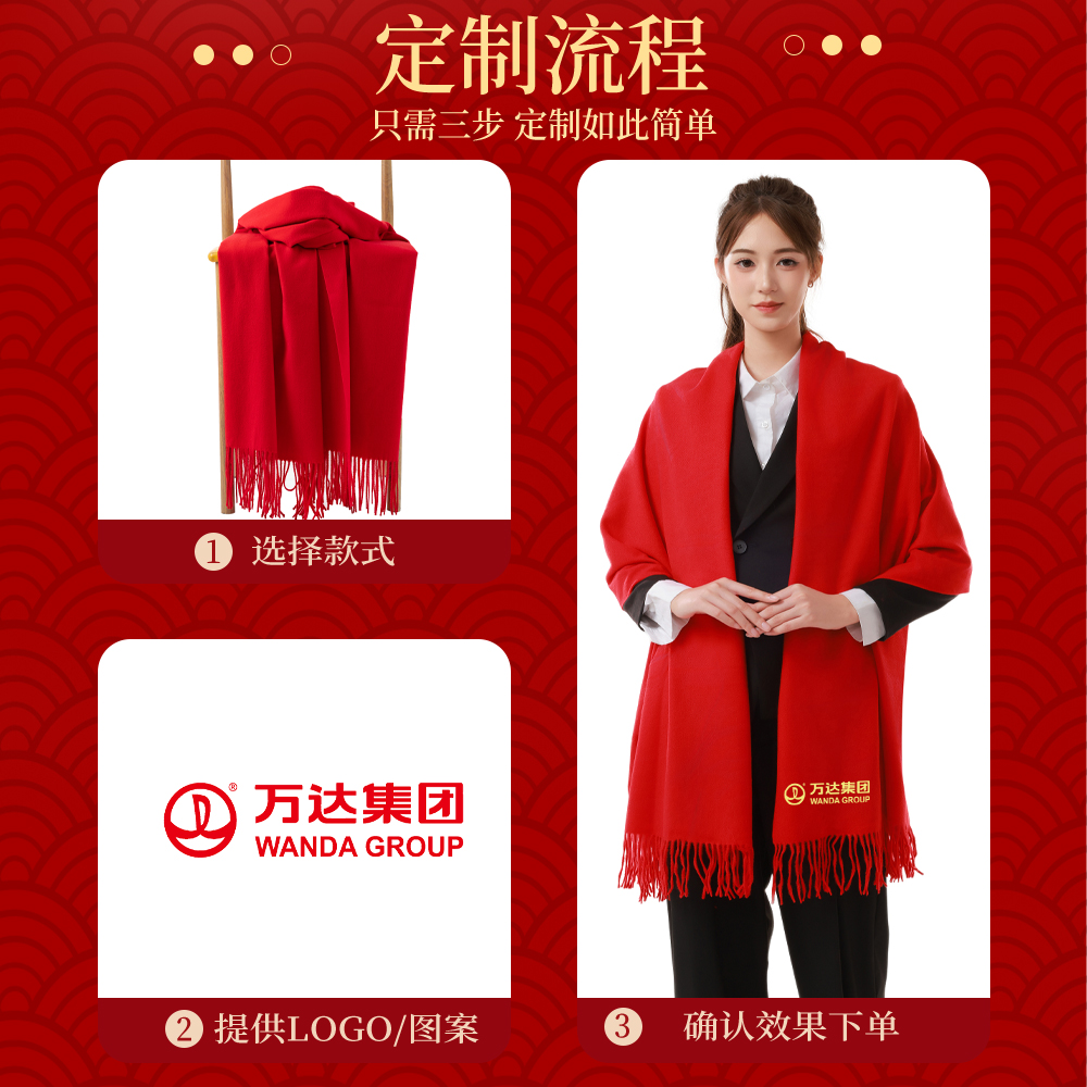 天猫宽版中国红围巾定制logo公司年会聚会活动大版红色围脖可披肩批发