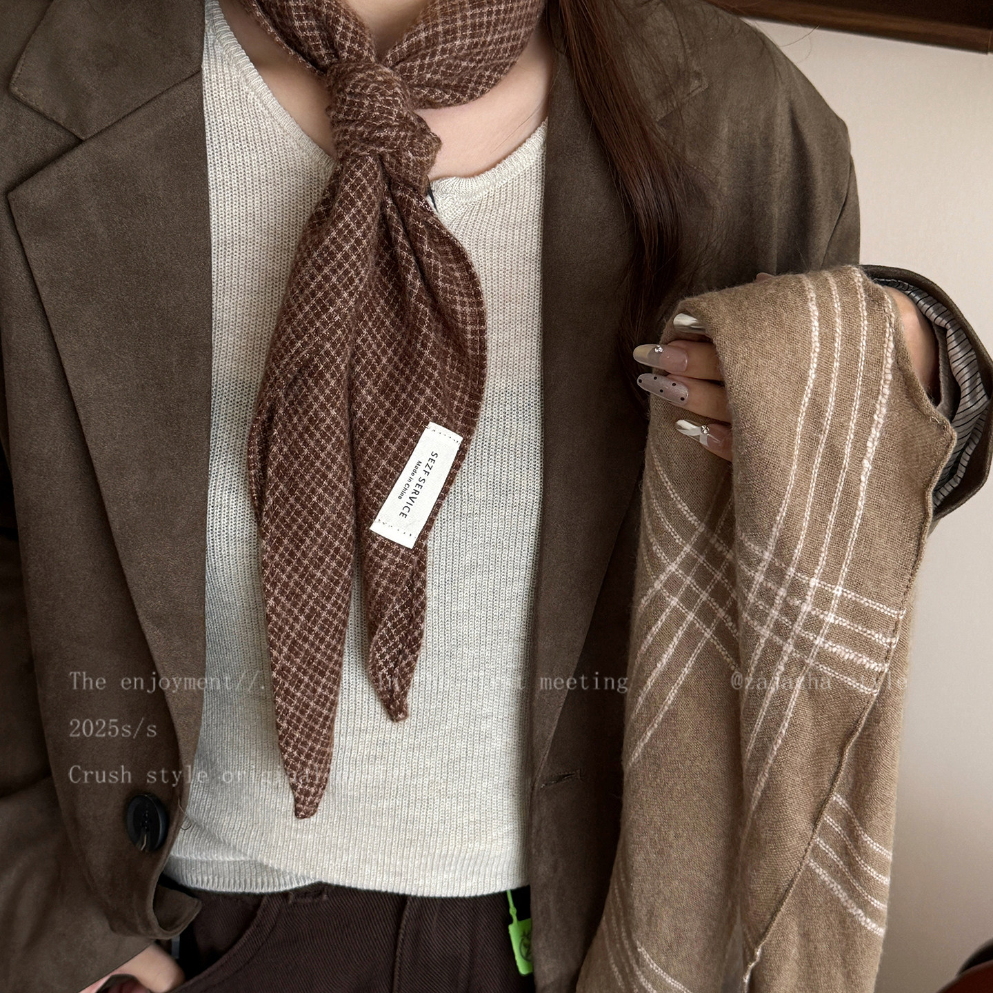 这款美拉德复古格子软糯丝巾,专为秋冬打造,融合高级质感与温暖实用性。采用柔软亲肤的优质面料,触感软糯细腻,佩戴舒适不扎肤。经典复古格子图案,搭配温暖的美拉德色调,尽显优雅知性气质,轻松提升整体穿搭格调。无论是作为围巾、三角巾,还是系于脖颈、包袋的时尚配饰,都能为秋冬造型增添一抹亮眼层次。轻盈保暖,兼具防风功能,适合日常通勤、约会或出行佩戴。多场景百搭,是秋冬不可或缺的精致单品,展现低调奢华的时尚态度。