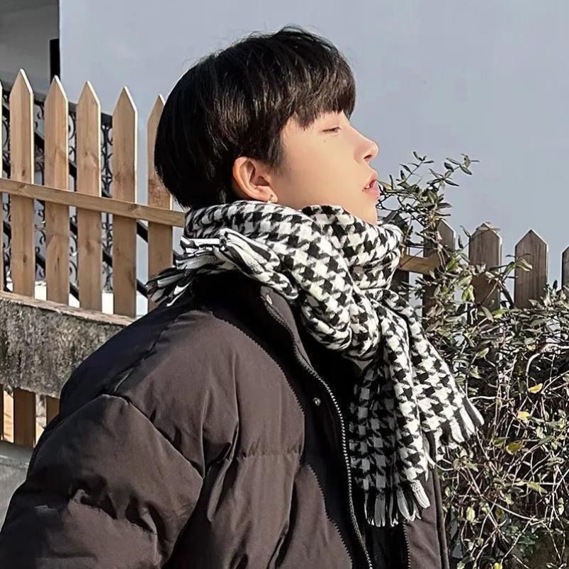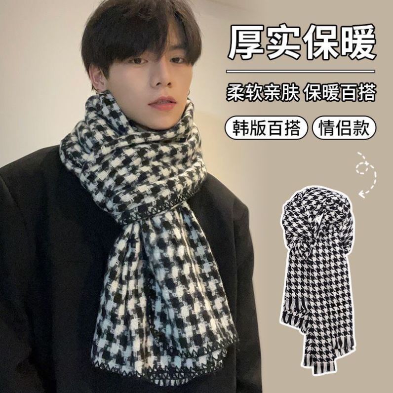 围巾秋冬季女冬天高级感加厚格子学生保暖围脖新款软糯黑色针织