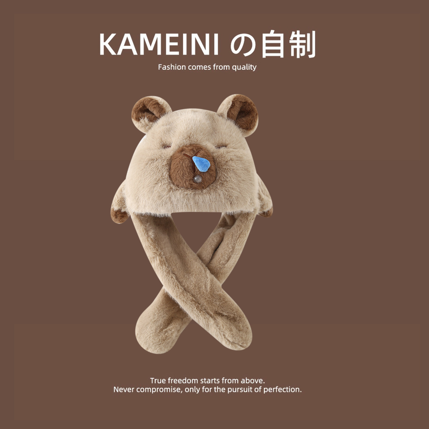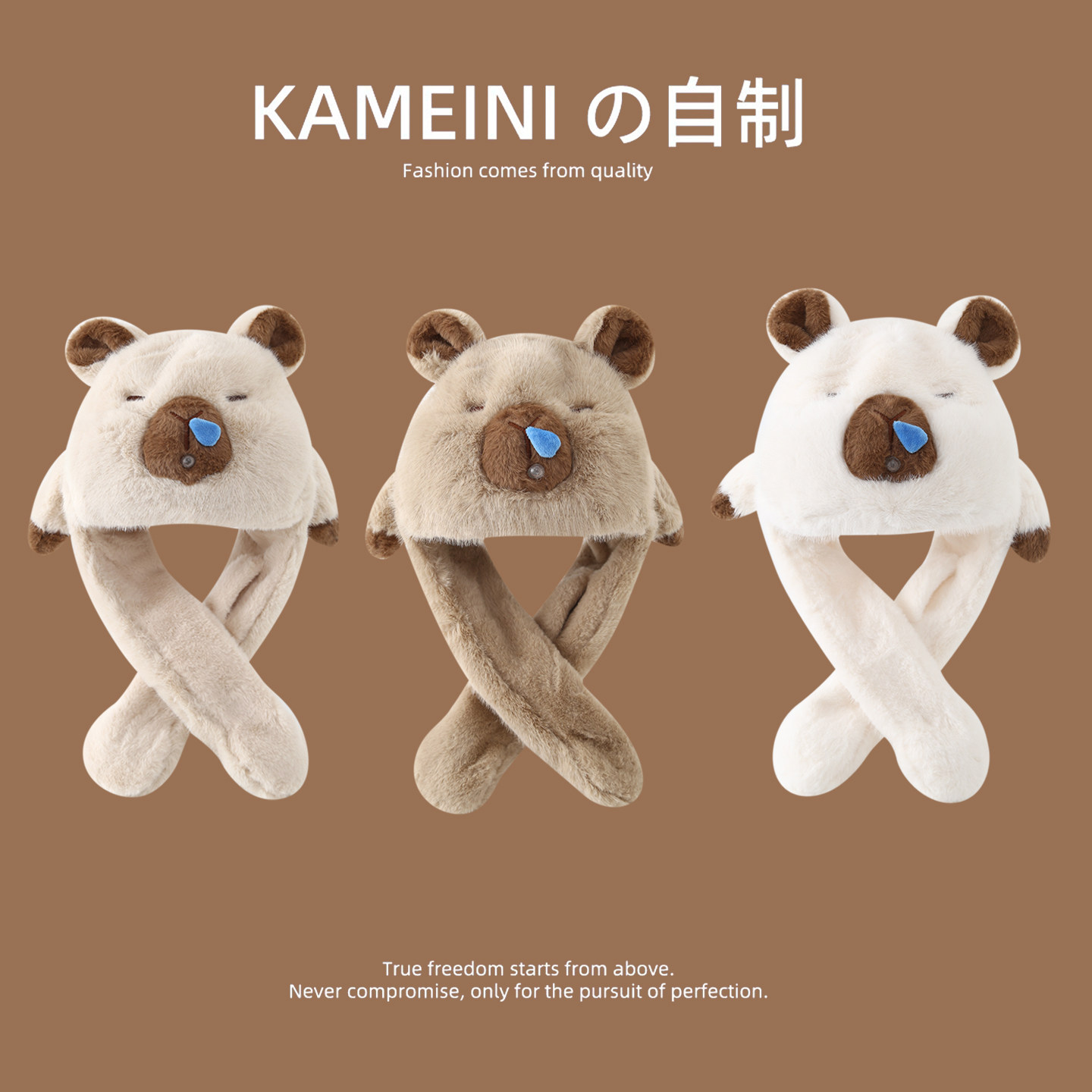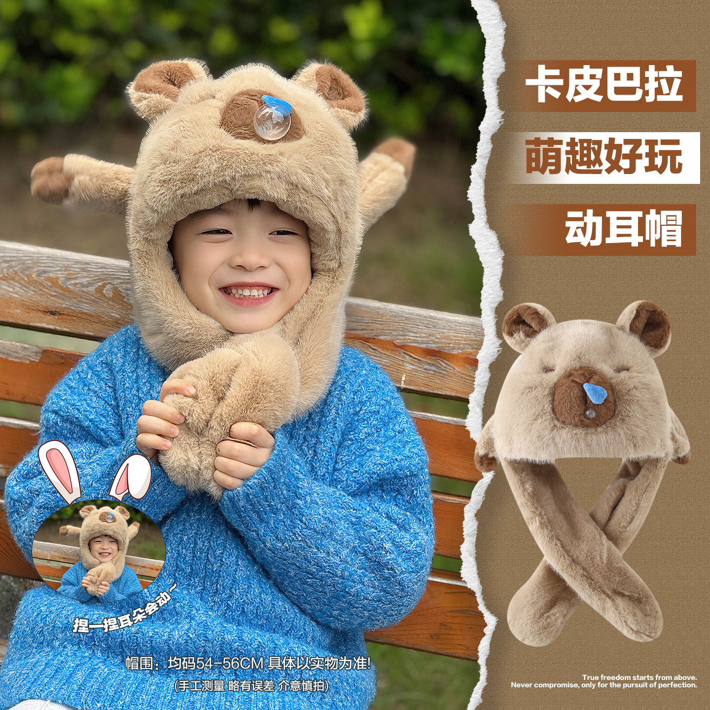 淘宝卡皮巴拉帽子儿童围巾一体捏耳朵会动的带围脖冬季小男孩女鼻涕泡