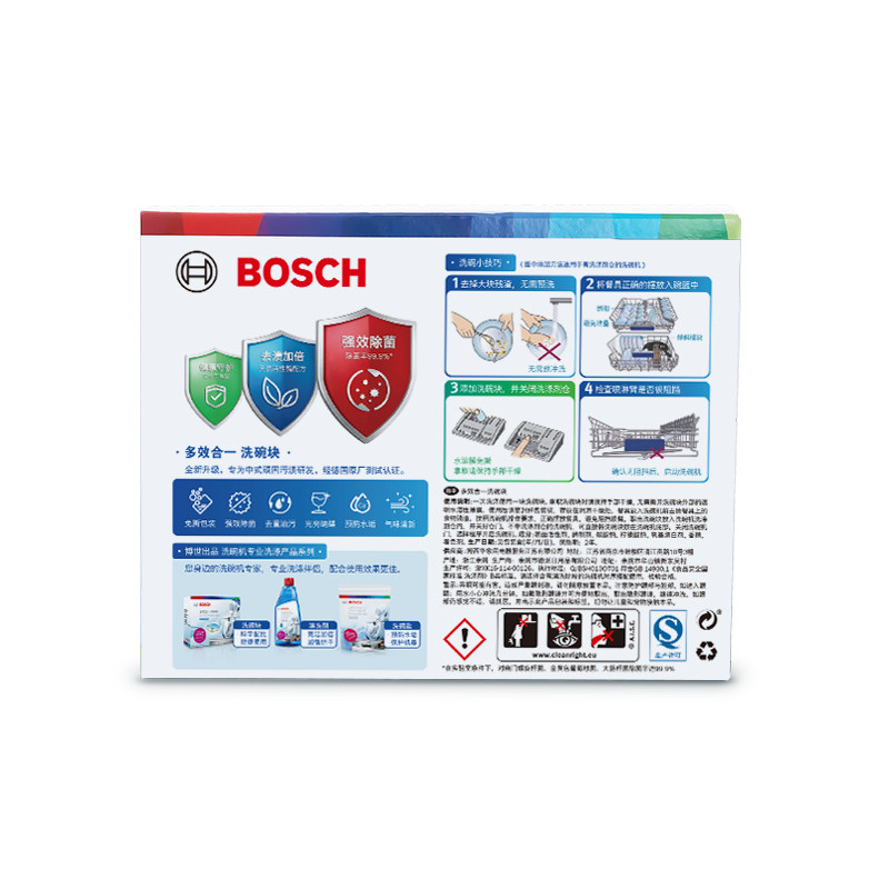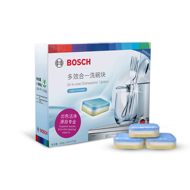 BOSCH博世洗碗机专用洗碗块洗涤剂,适用于博世全系列洗碗机型号,兼容性强,无需担心适配问题。每盒含30块独立包装洗涤块,使用方便,用量精准,避免浪费。产品采用高效去污配方,集洗涤、漂洗、软水、除菌等多重功效于一体,有效分解顽固油渍与食物残渣,确保餐具洁净如新。相比传统洗碗粉或凝珠,洗碗块溶解更彻底,不留残留,保护机器内部管路。环保无磷配方,安全温和,呵护家人健康。无论是日常轻污还是重油餐具,都能轻松应对,是博世洗碗机用户的理想耗材之选,让洗碗更高效、更省心。