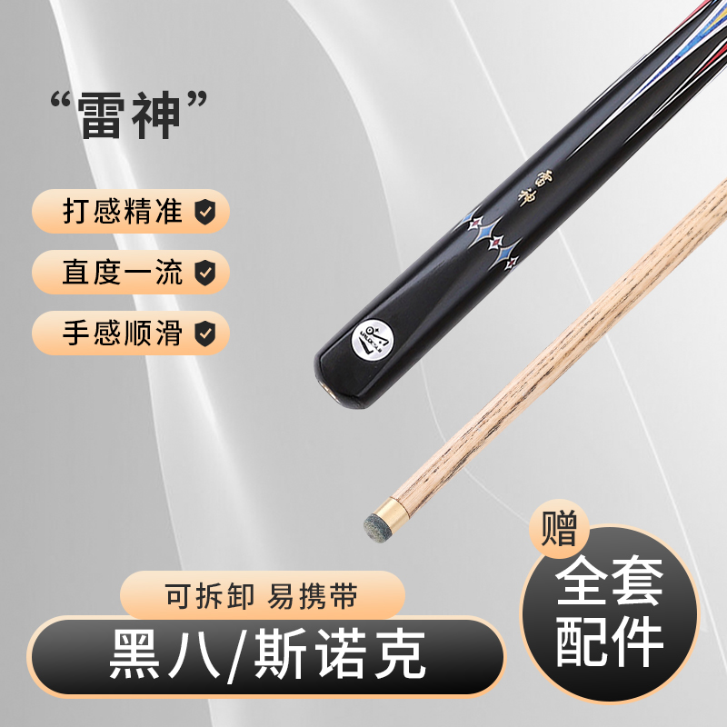 淘宝雷神台球杆小头杆中式黑八专用四面贴花3/4分体斯诺克九球白木蜡