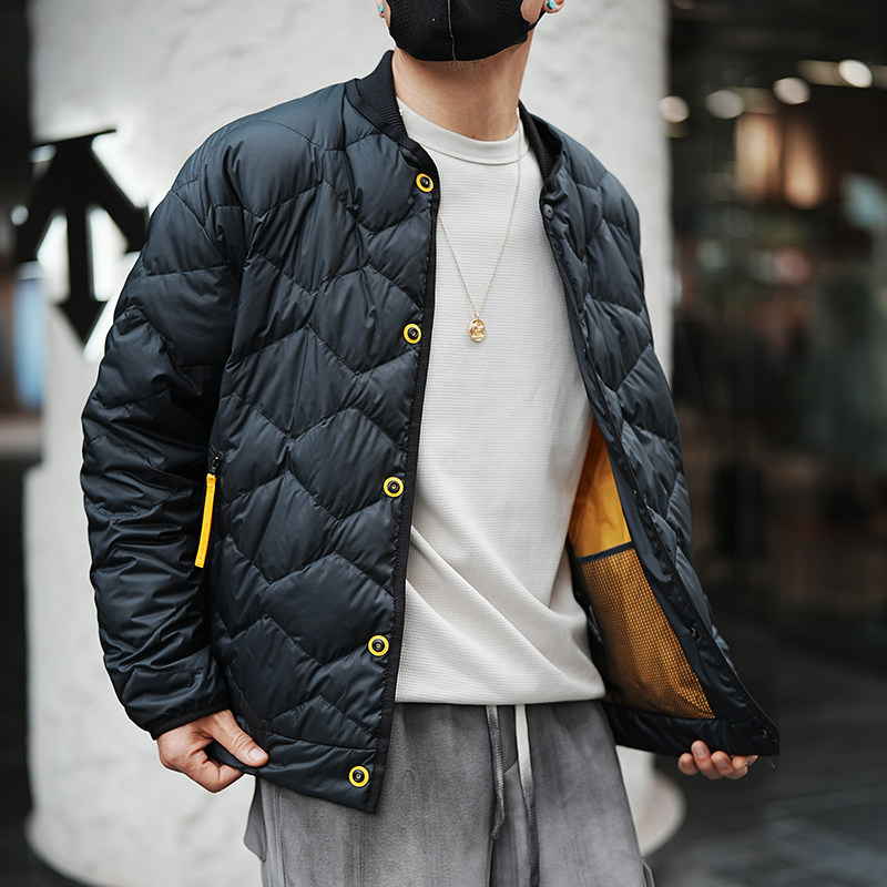 淘宝美式复古菱形纹飞行员棒球领羽绒服男潮牌冬季爆款痞帅白鸭绒外套